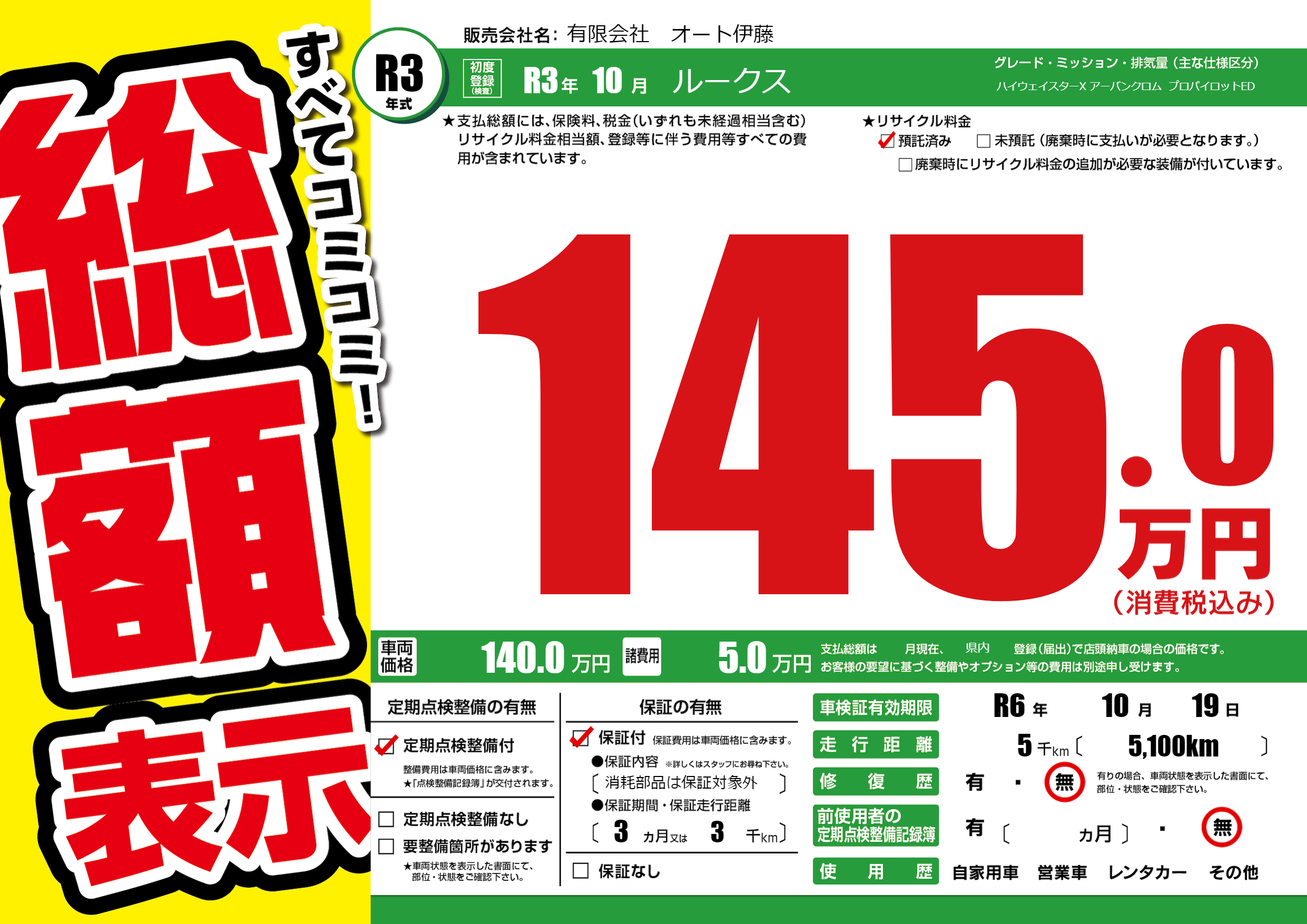 保証付き 保証内容(消耗部品は保証対象外) 3ヶ月または(3)千kmまで |