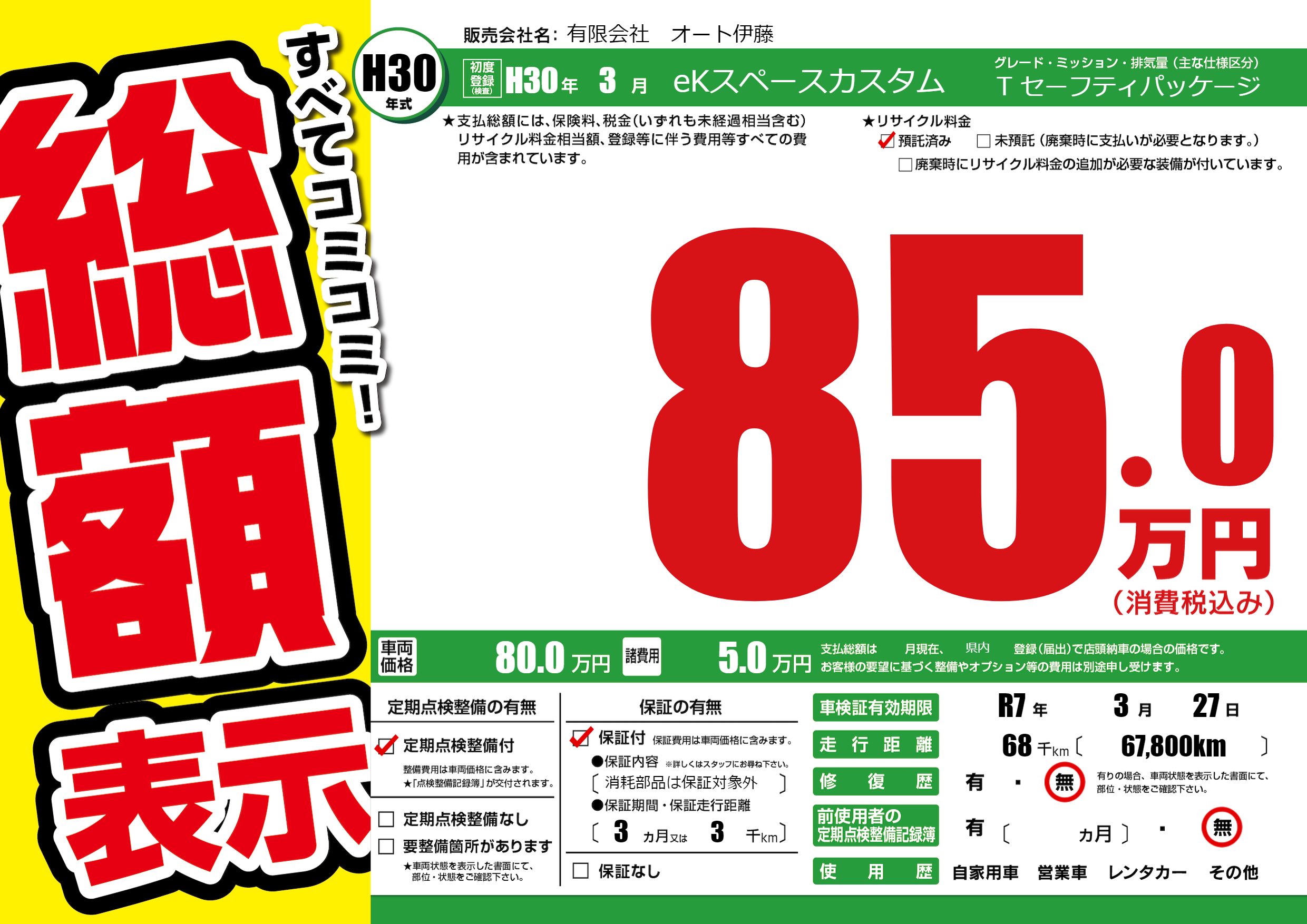 | 走行キロ | 6.8万km | 初年度登録 | H30年3月 |