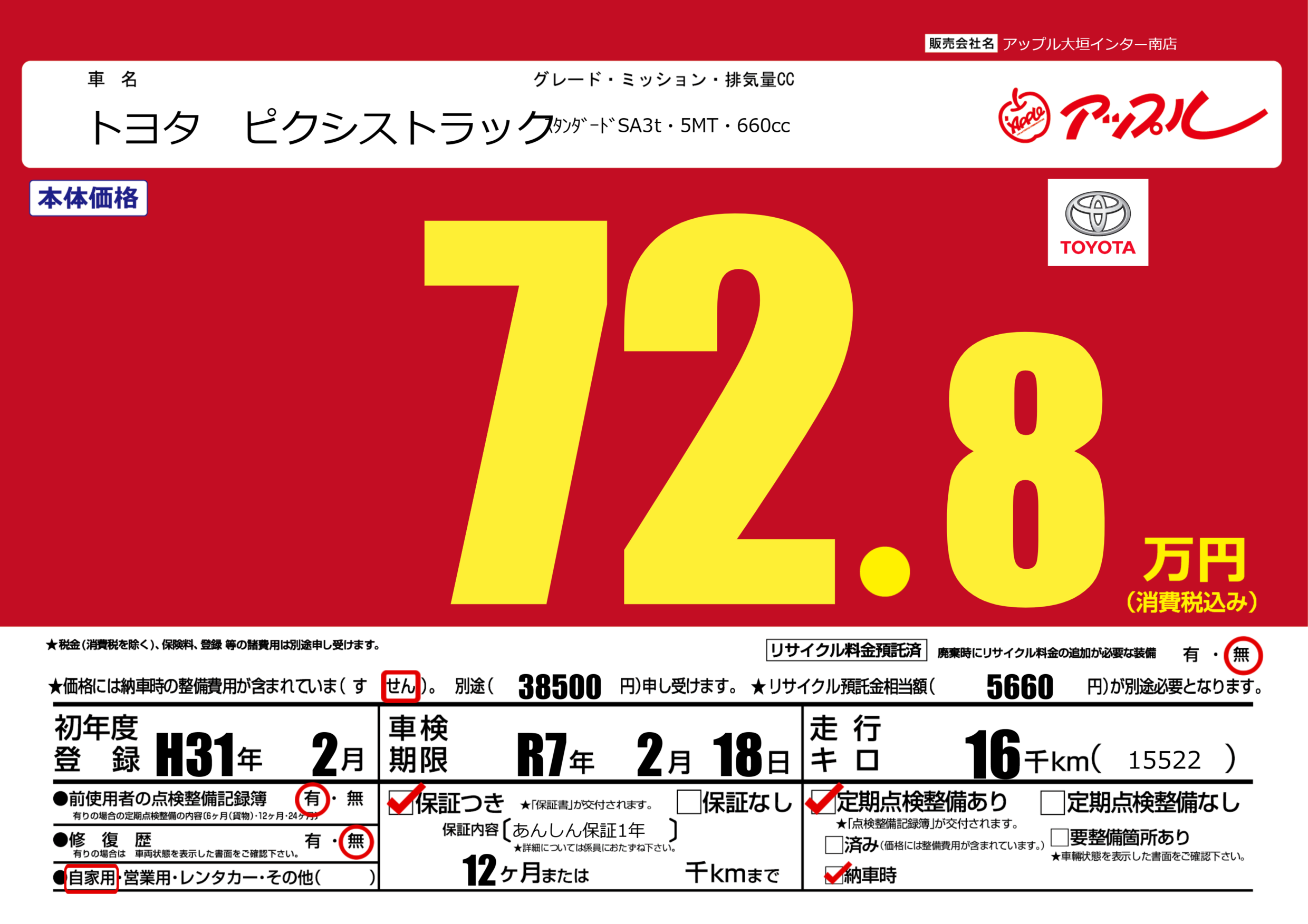 保証付き 保証内容(あんしん保証1年) 12ヶ月または千km |