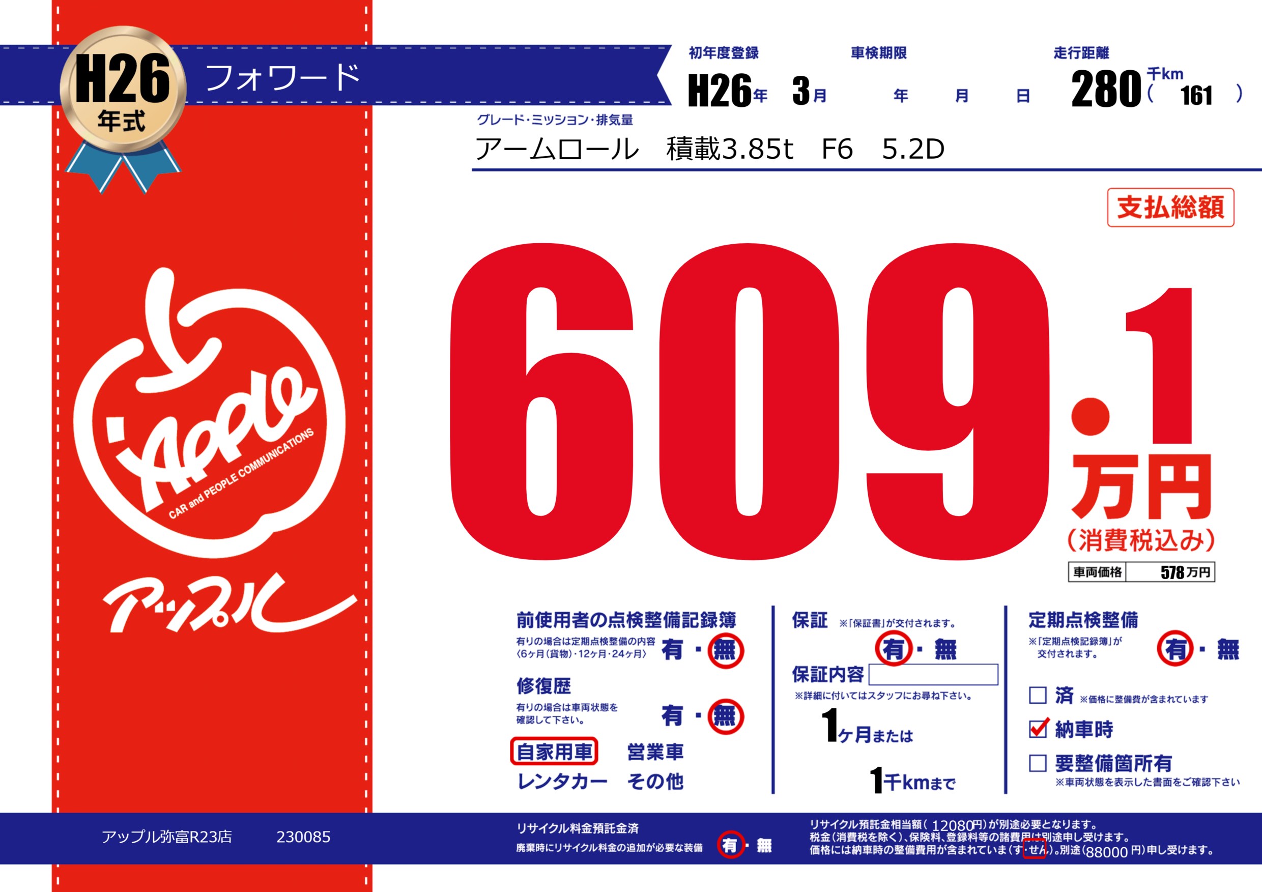保証付き 保証内容(---) 1ヶ月または(1)千kmまで |