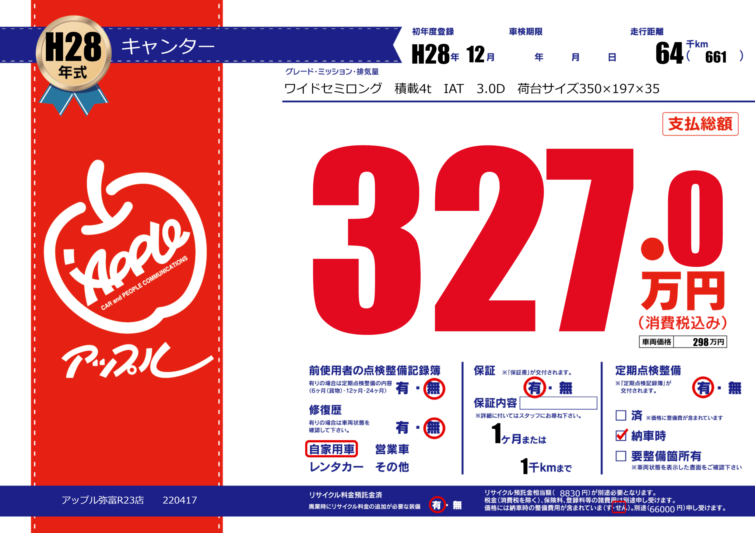 | 車名 | キャンター | グレード ミッション 排気量 |