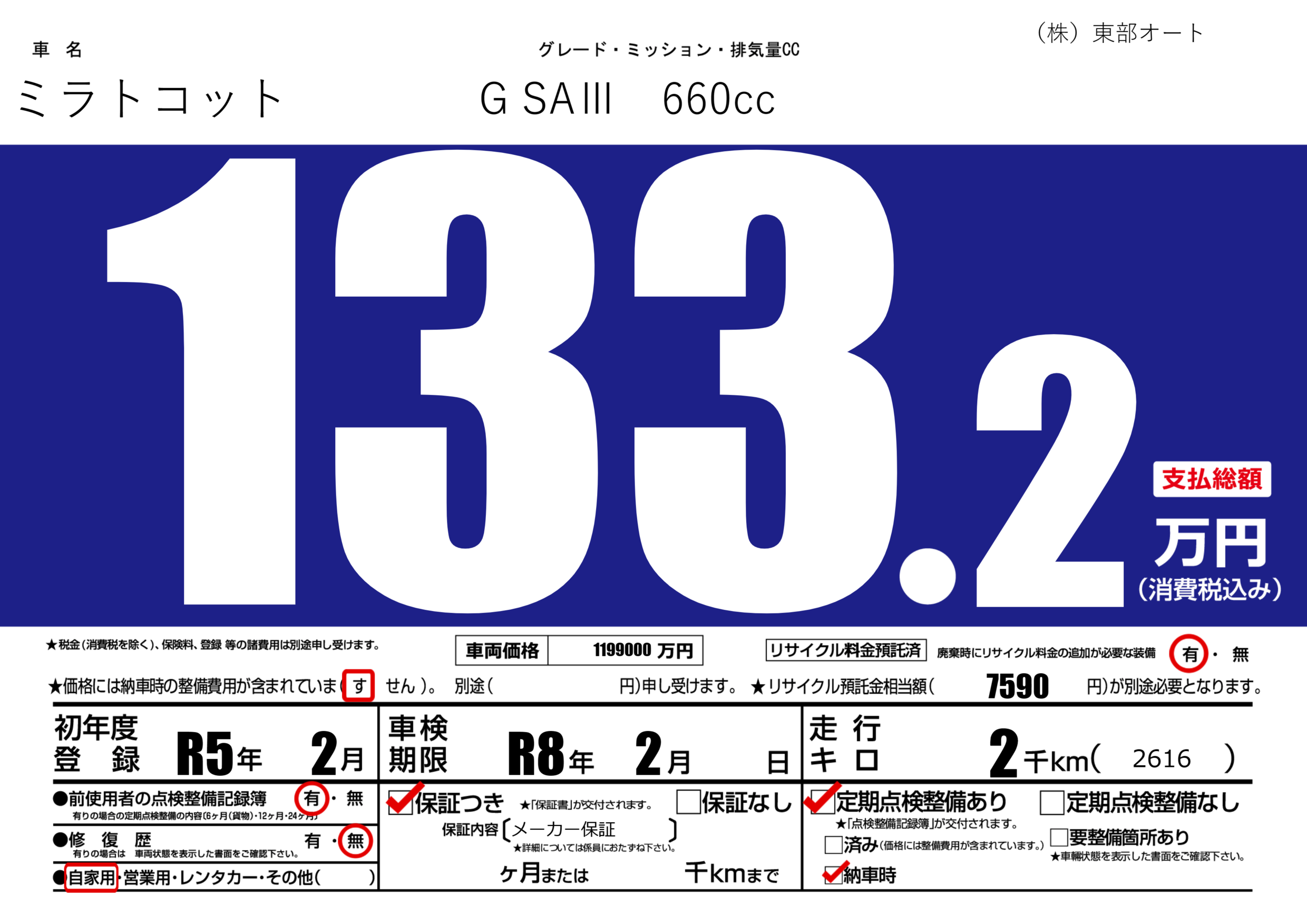 | 車検制限 | R8年 2月 - 日 | ||