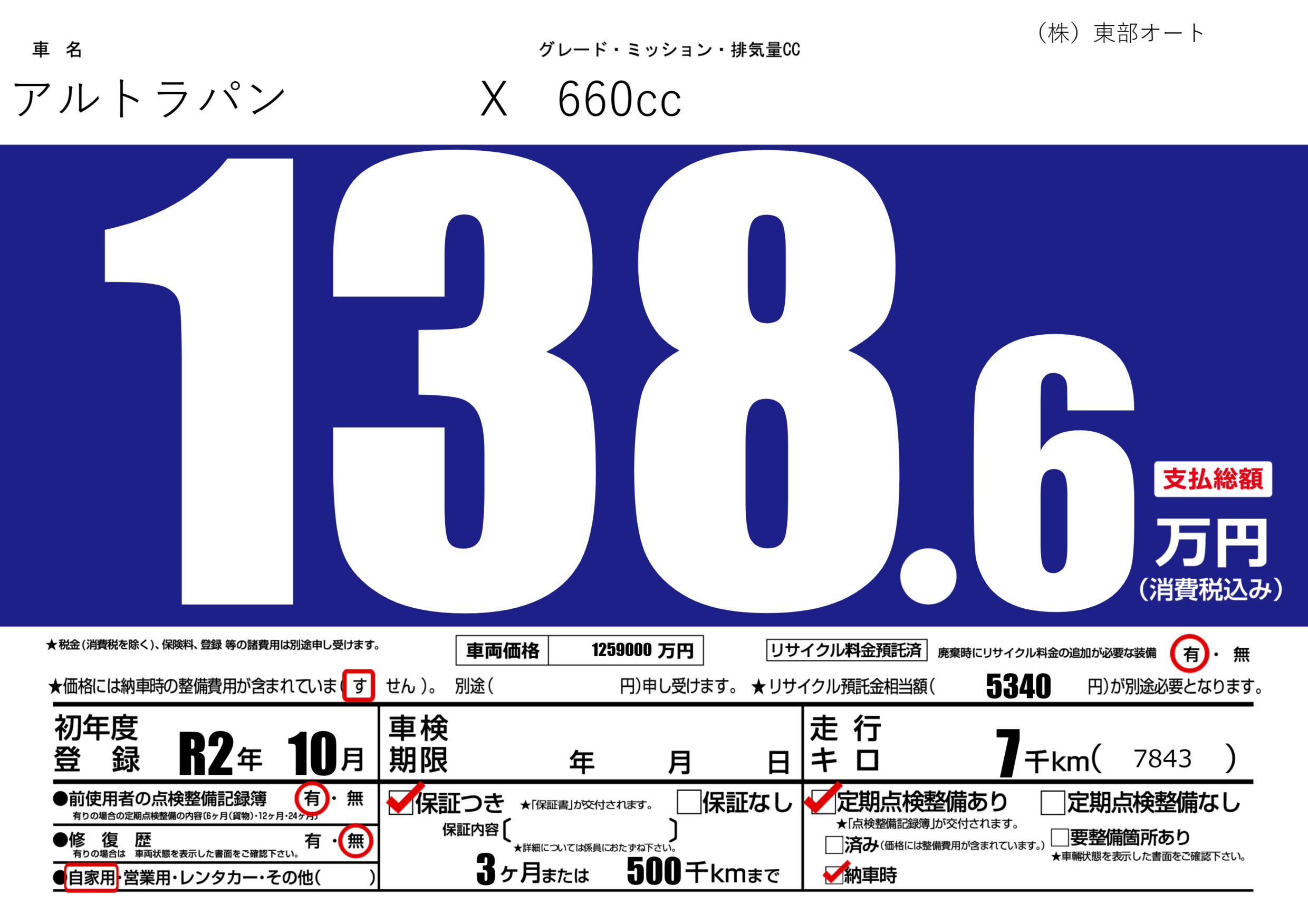 保証付き 保証内容(---) 3ヶ月または(500)千kmまで |