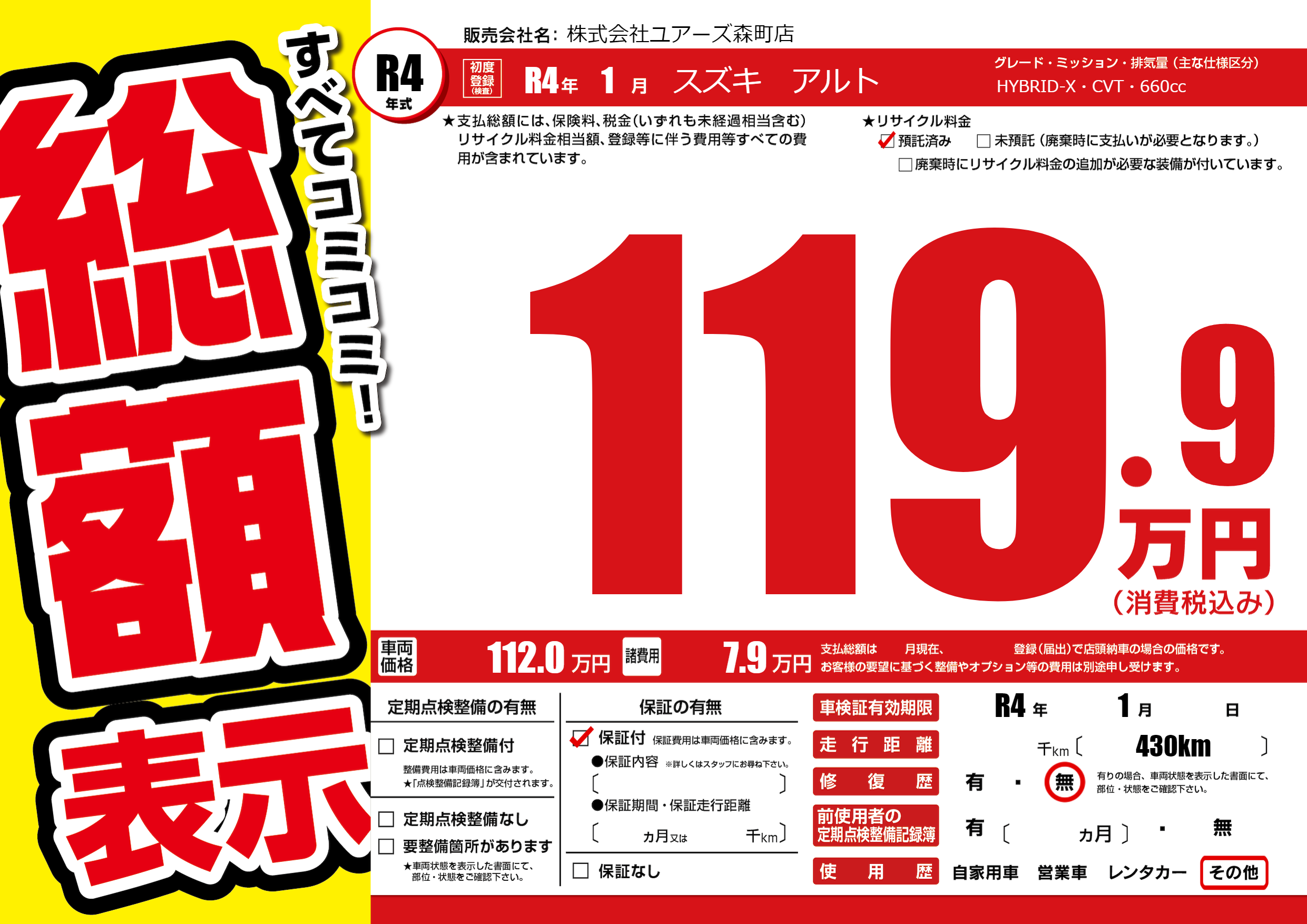 | 車名 | スズキ アルト | グレード ミッション 排気量 |