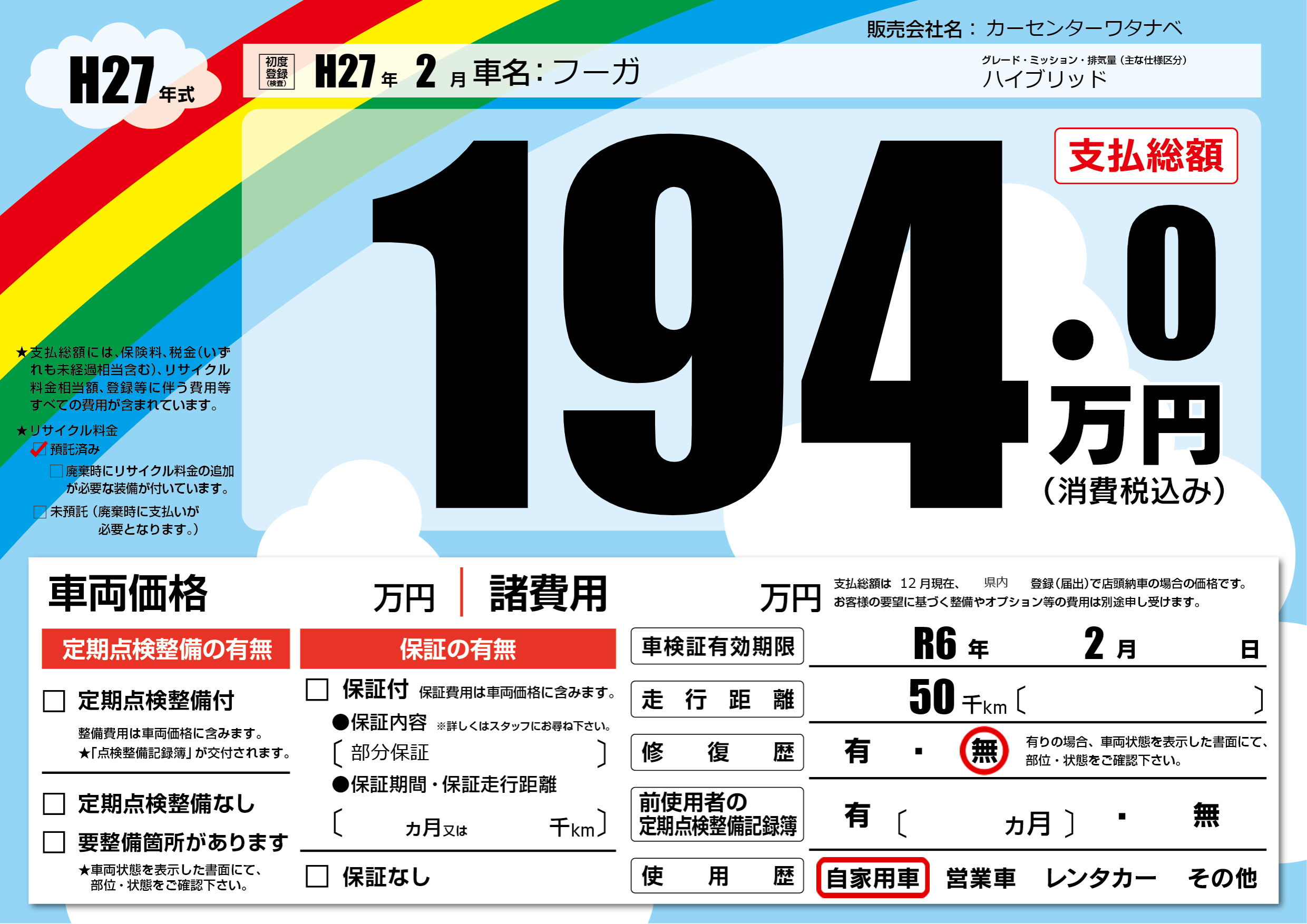 | 走行キロ | 5万km | 初年度登録 | H27年2月 |