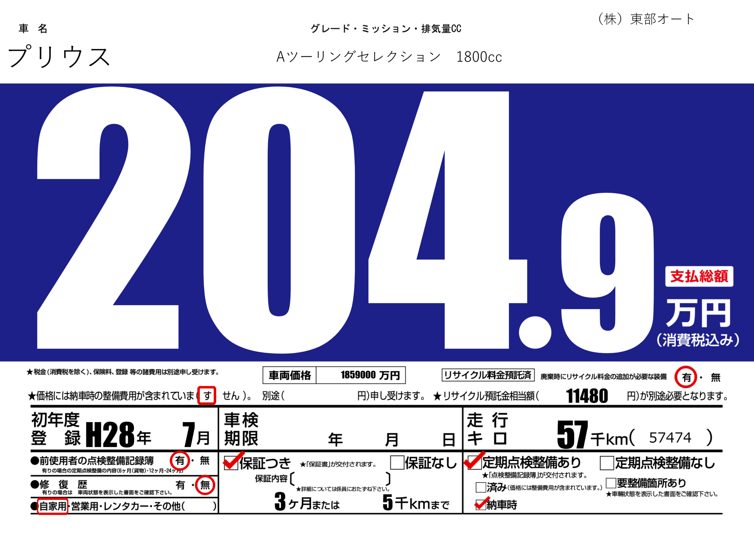 | 車名 | プリウス | グレード ミッション 排気量 |