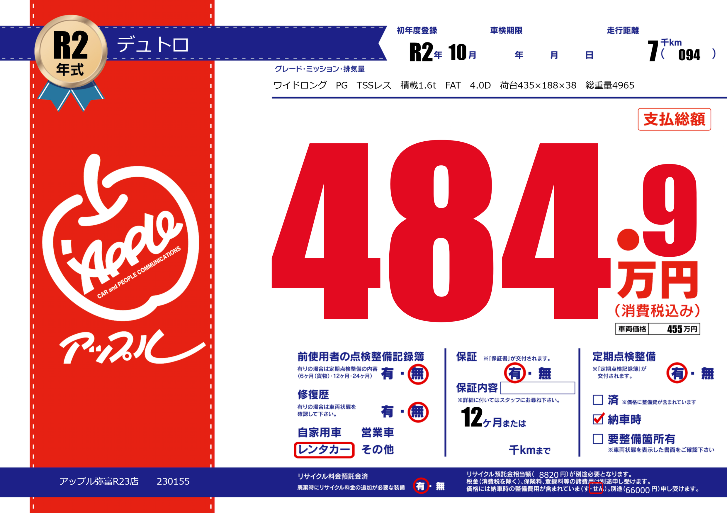 | 走行キロ | 0.7万km | 初年度登録 | R2年10月 |