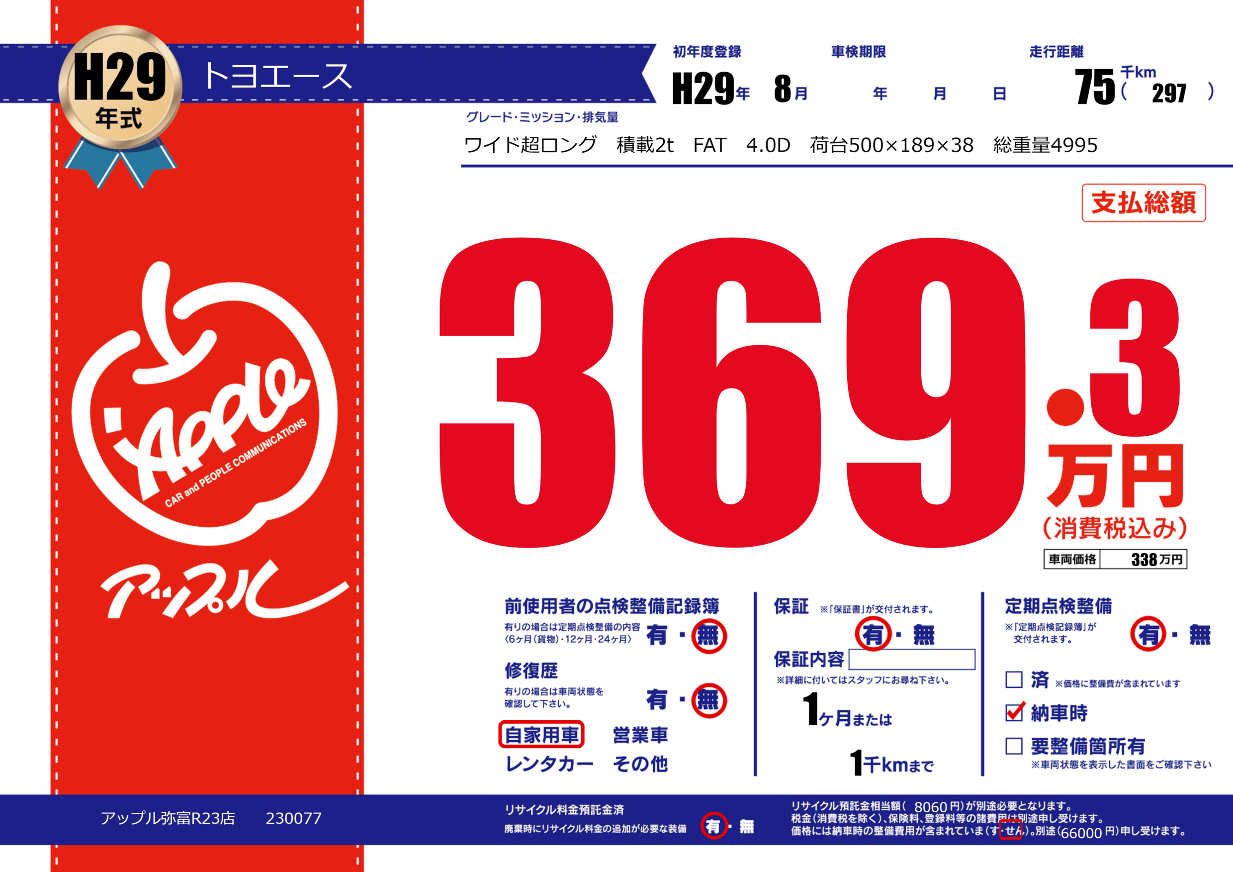 | 走行キロ | 7.5万km | 初年度登録 | H29年8月 |