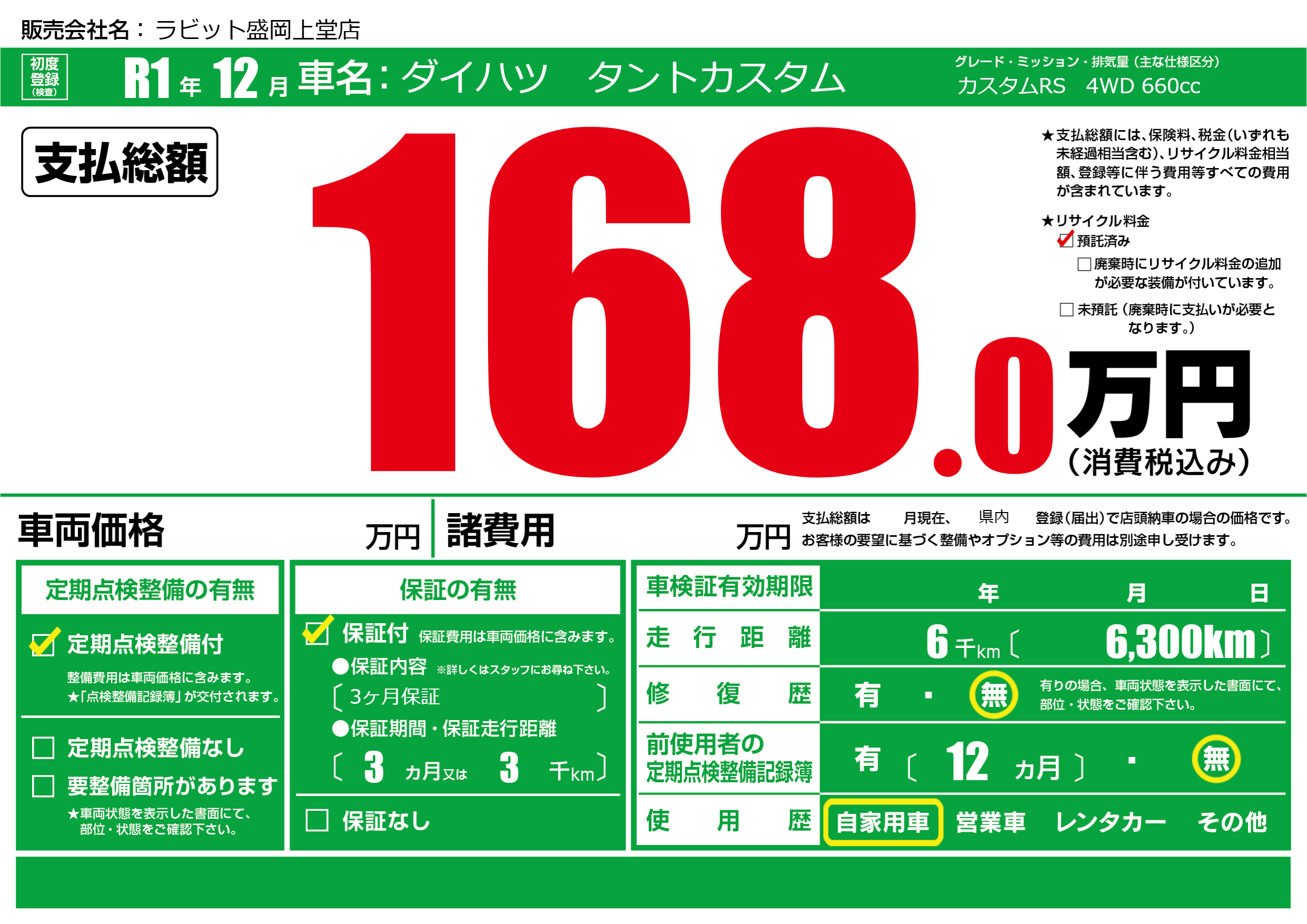 | 車名 | ダイハツ タントカスタム | グレード ミッション 排気量 |