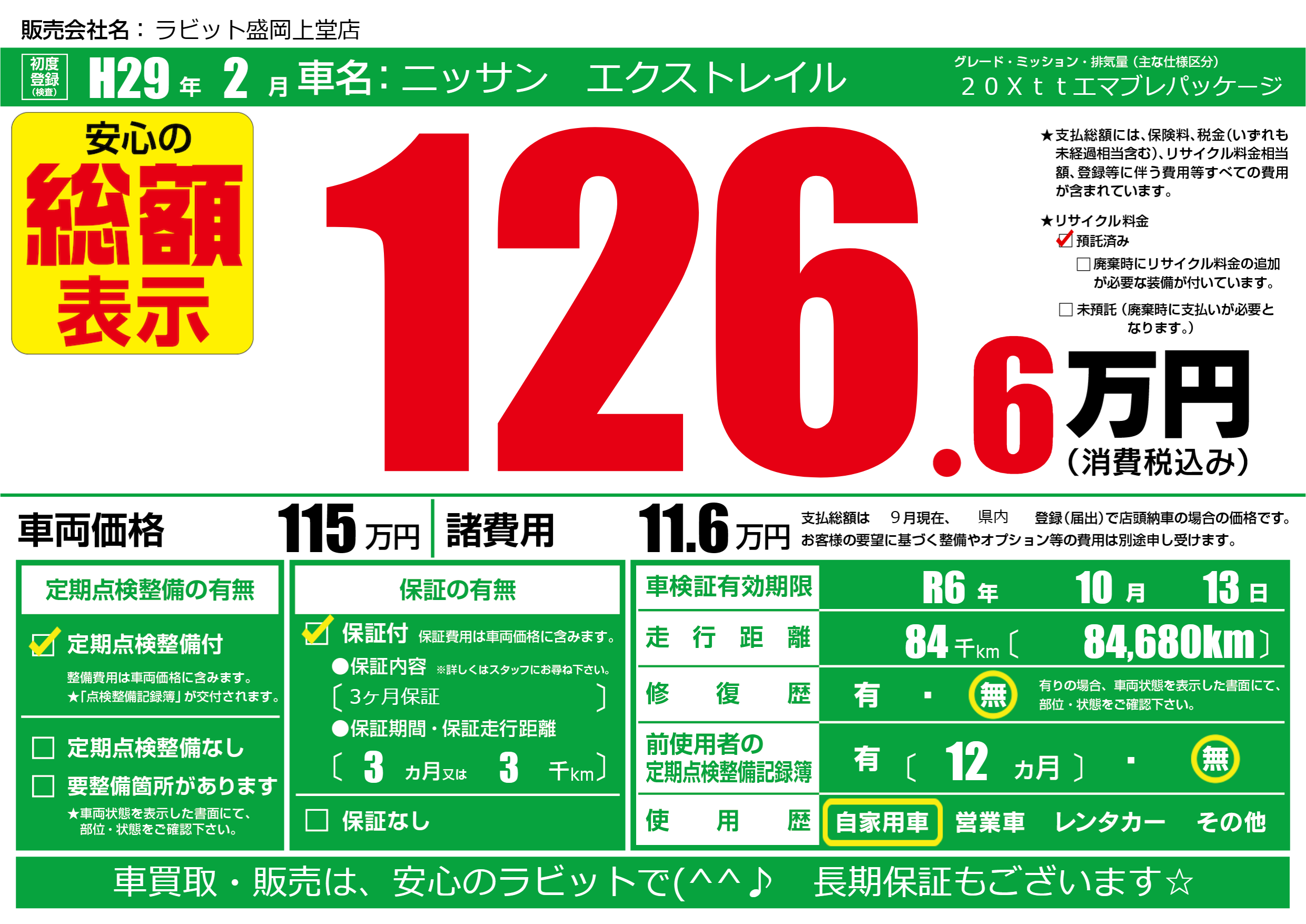 | 走行キロ | 8.4万km | 初年度登録 | H29年2月 |