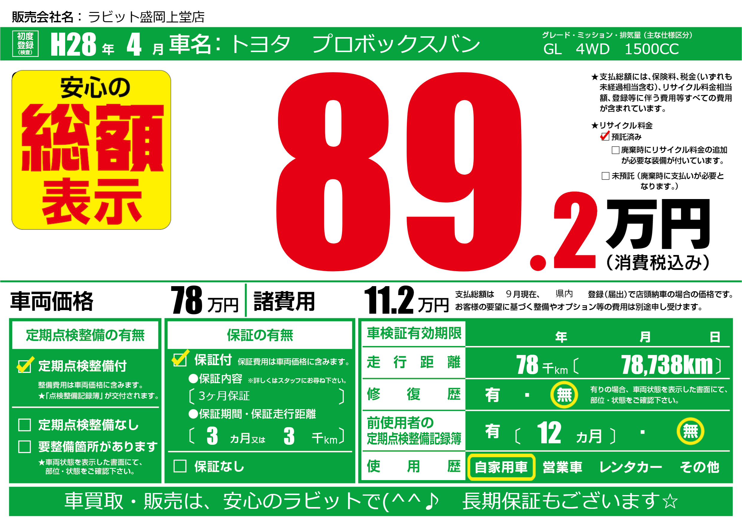 | 車名 | トヨタ プロボックスバン | グレード ミッション 排気量 |
