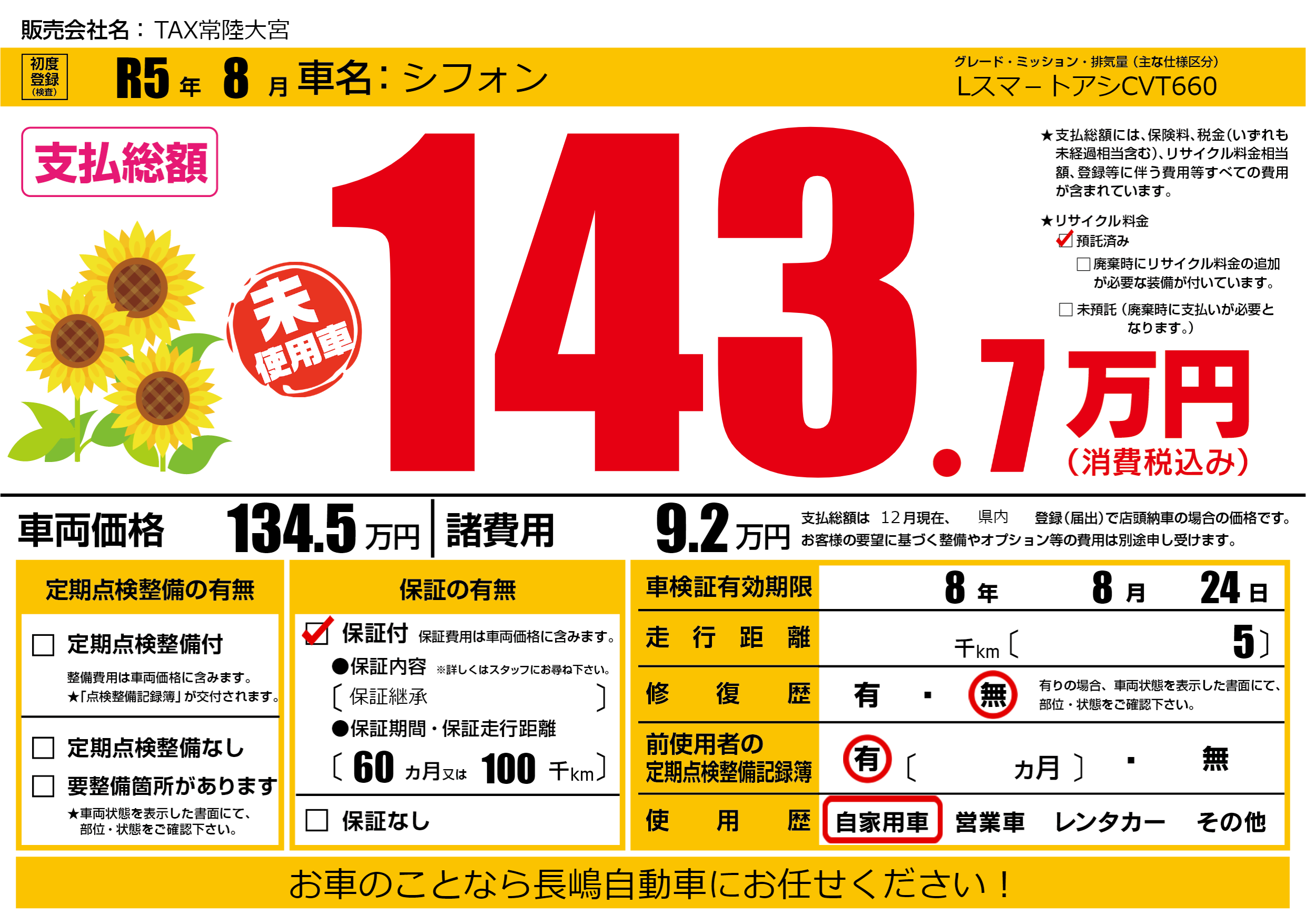 | 走行キロ | - | 初年度登録 | R5年8月 |