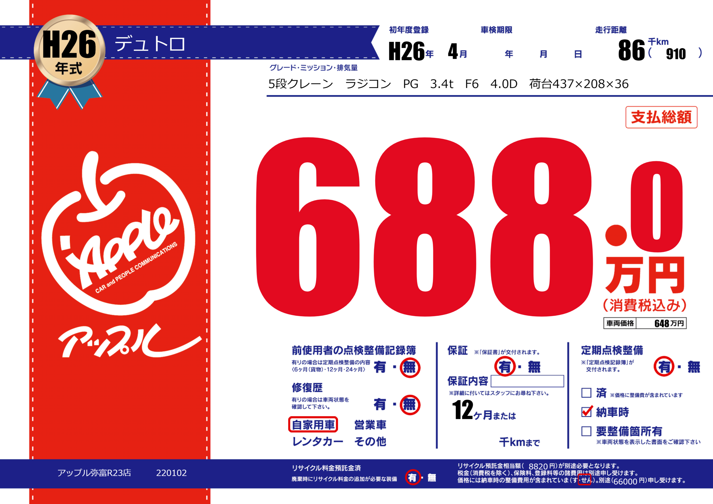| 走行キロ | 8.6万km | 初年度登録 | H26年4月 |