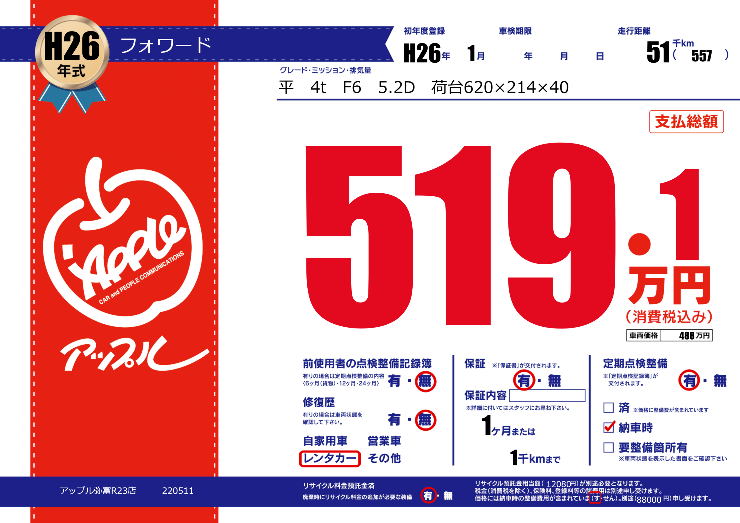 | 走行キロ | 5.1万km | 初年度登録 | H26年1月 |