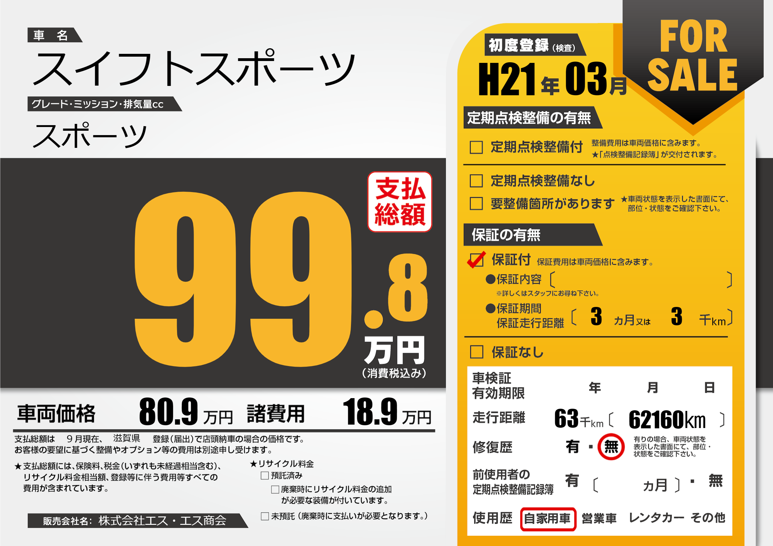 保証付き 保証内容(---) 3ヶ月または(3)千kmまで |