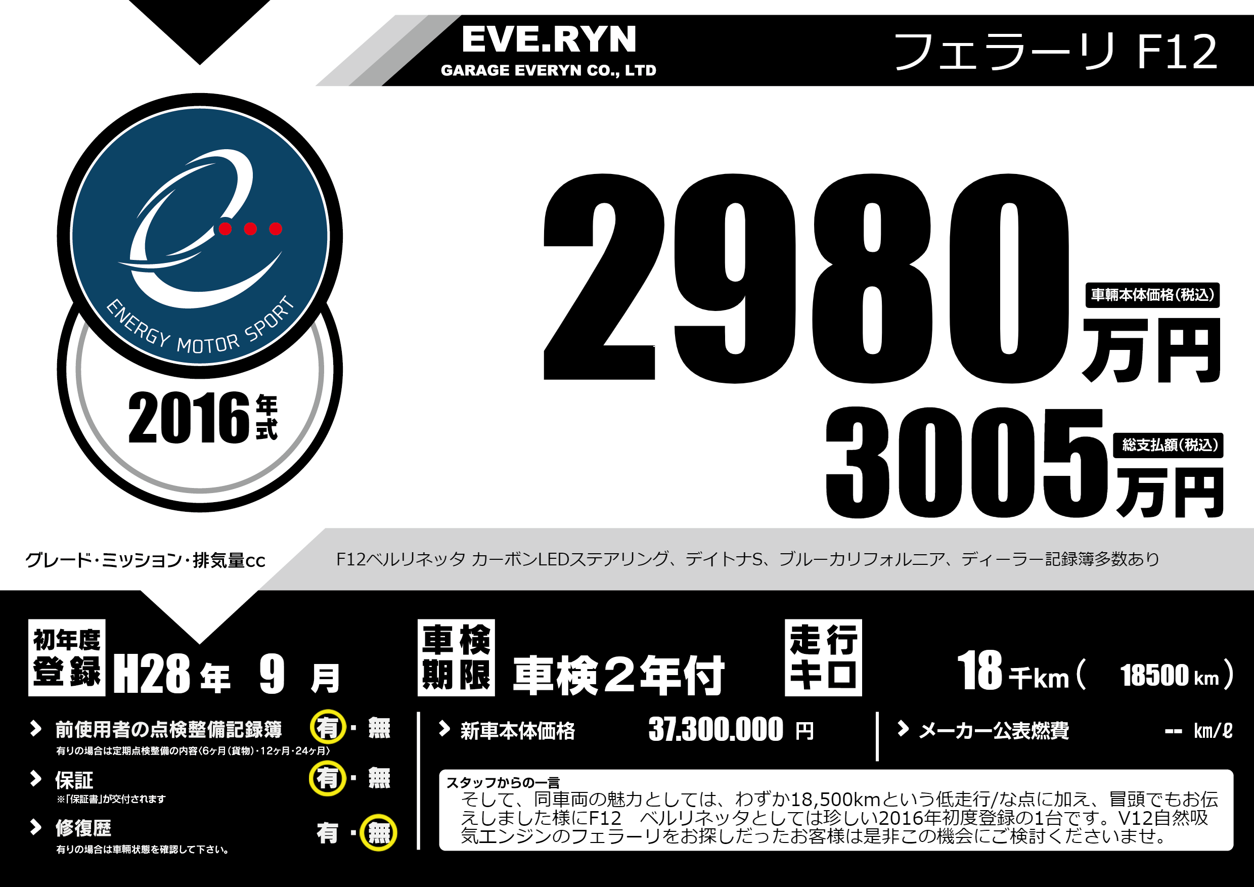 | 車名 | フェラーリ F12 | グレード ミッション 排気量 |