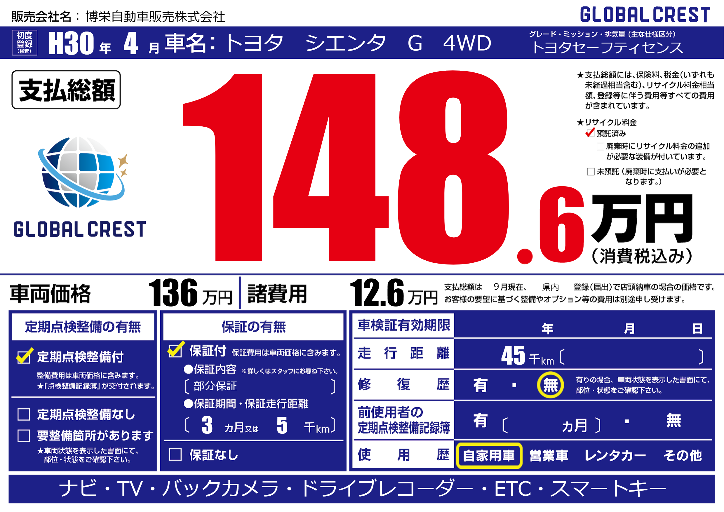 | 車名 | トヨタ シエンタ G 4WD | グレード ミッション 排気量 |