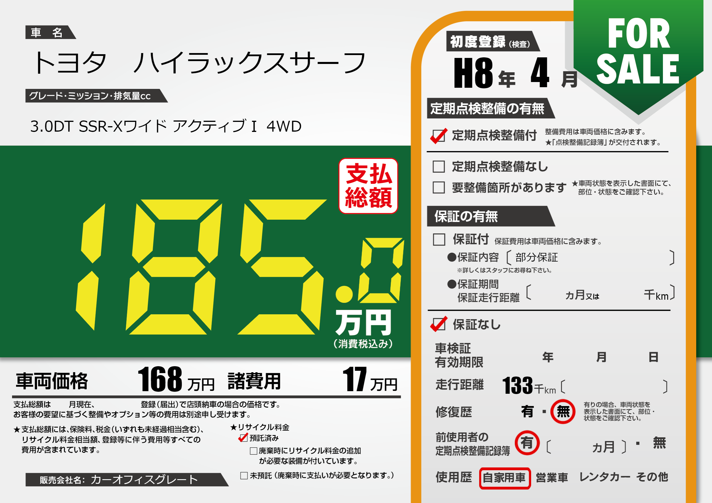 | 車名 | トヨタ ハイラックスサーフ | グレード ミッション 排気量 |