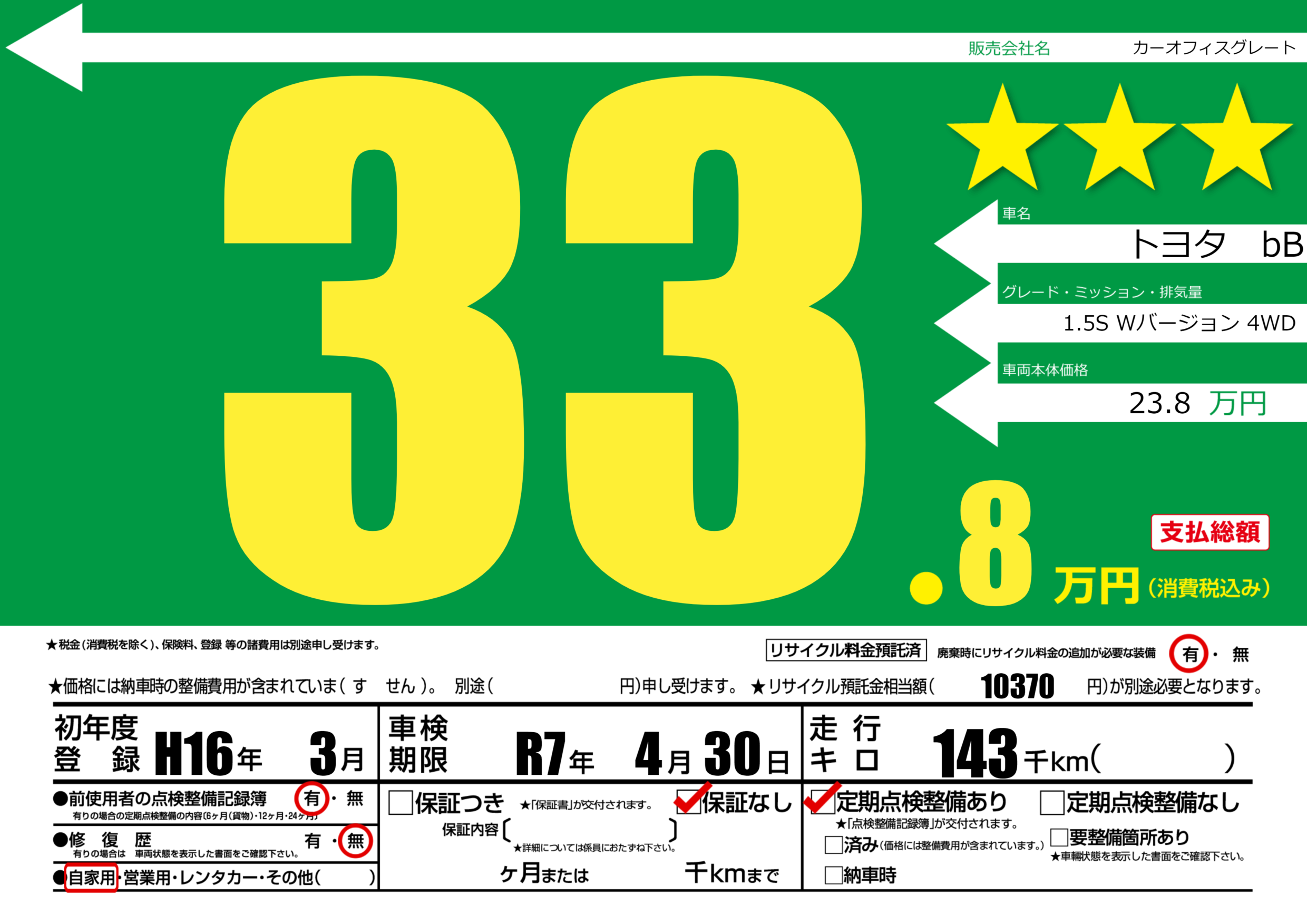 | 車名 | トヨタ bB | グレード ミッション 排気量 |