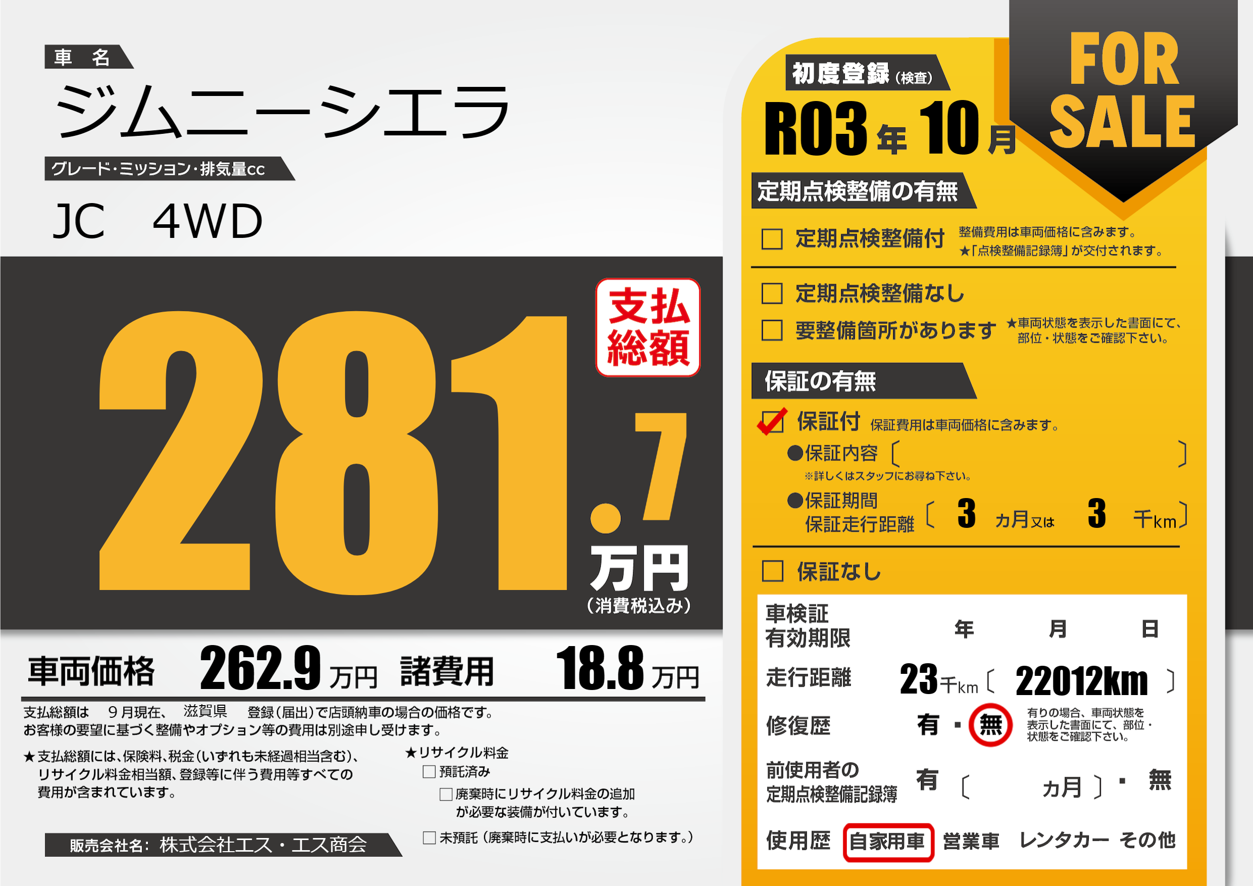 | 車名 | ジムニーシエラ | グレード ミッション 排気量 |