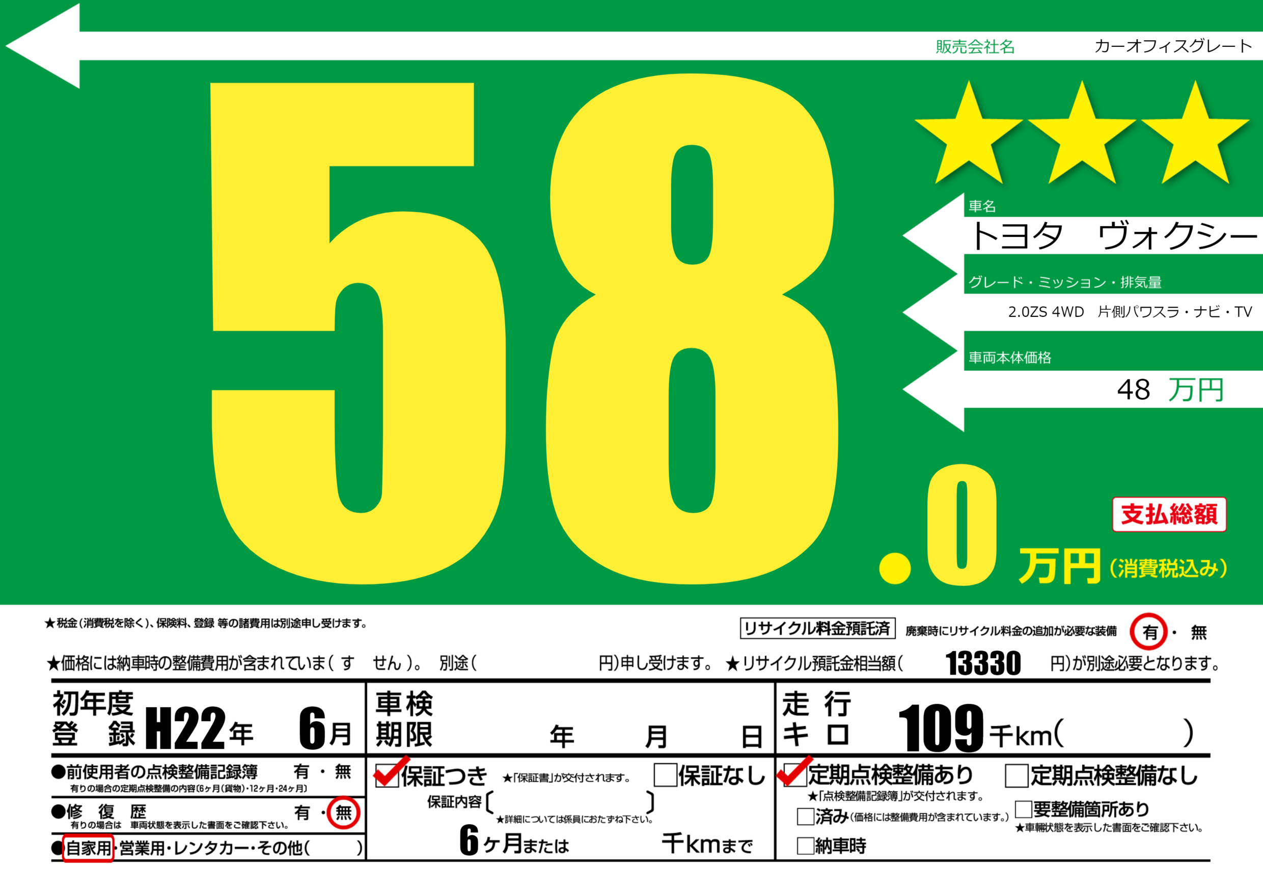| 走行キロ | 10.9万km | 初年度登録 | H22年6月 |
