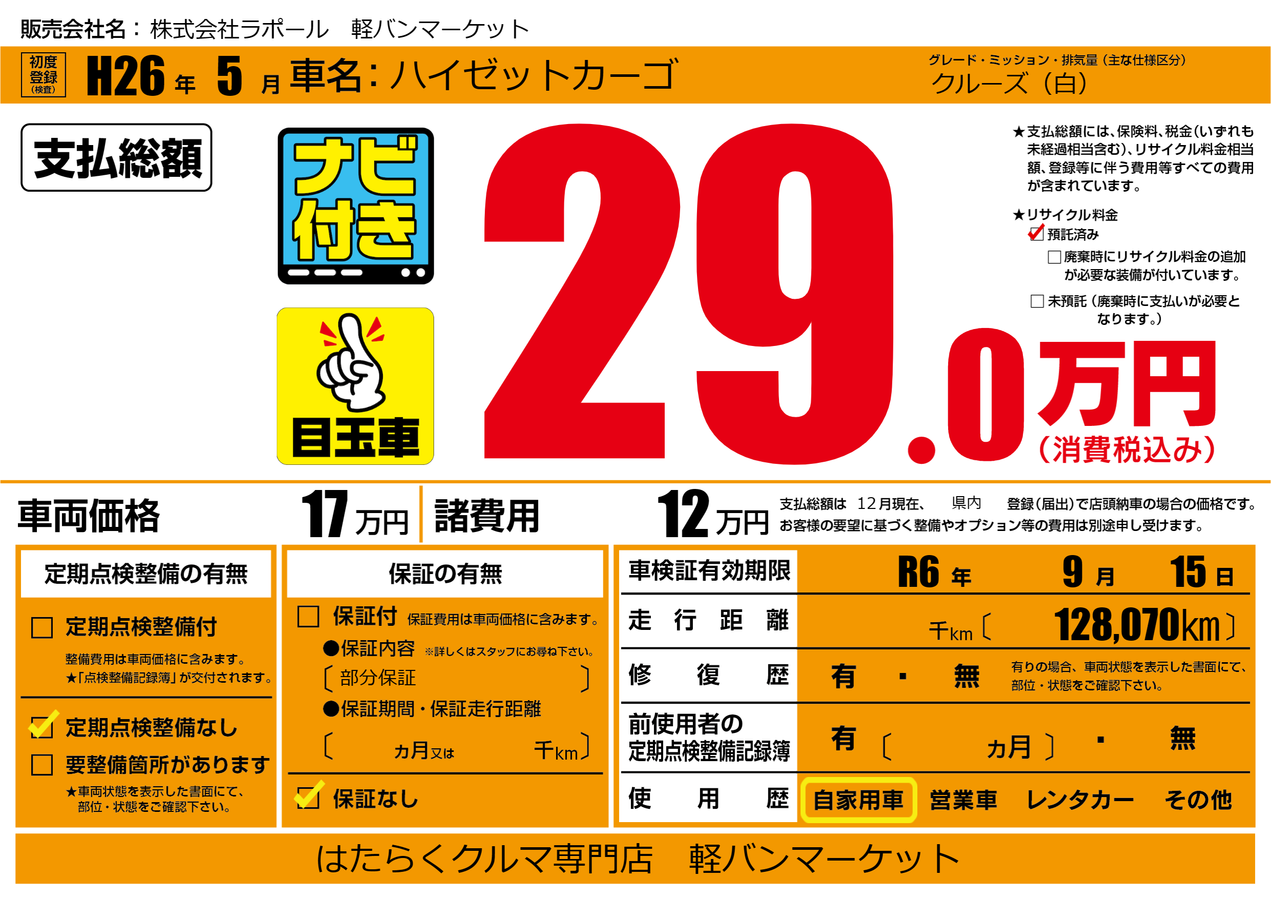 | 走行キロ | - | 初年度登録 | H26年5月 |