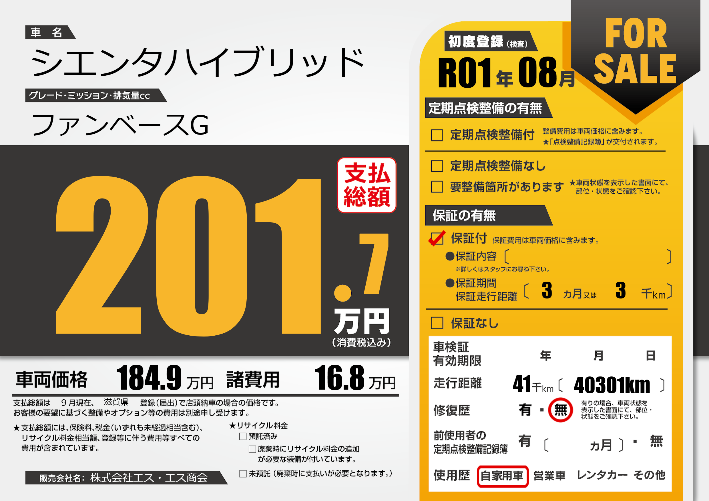 | 車名 | シエンタハイブリッド | グレード ミッション 排気量 |