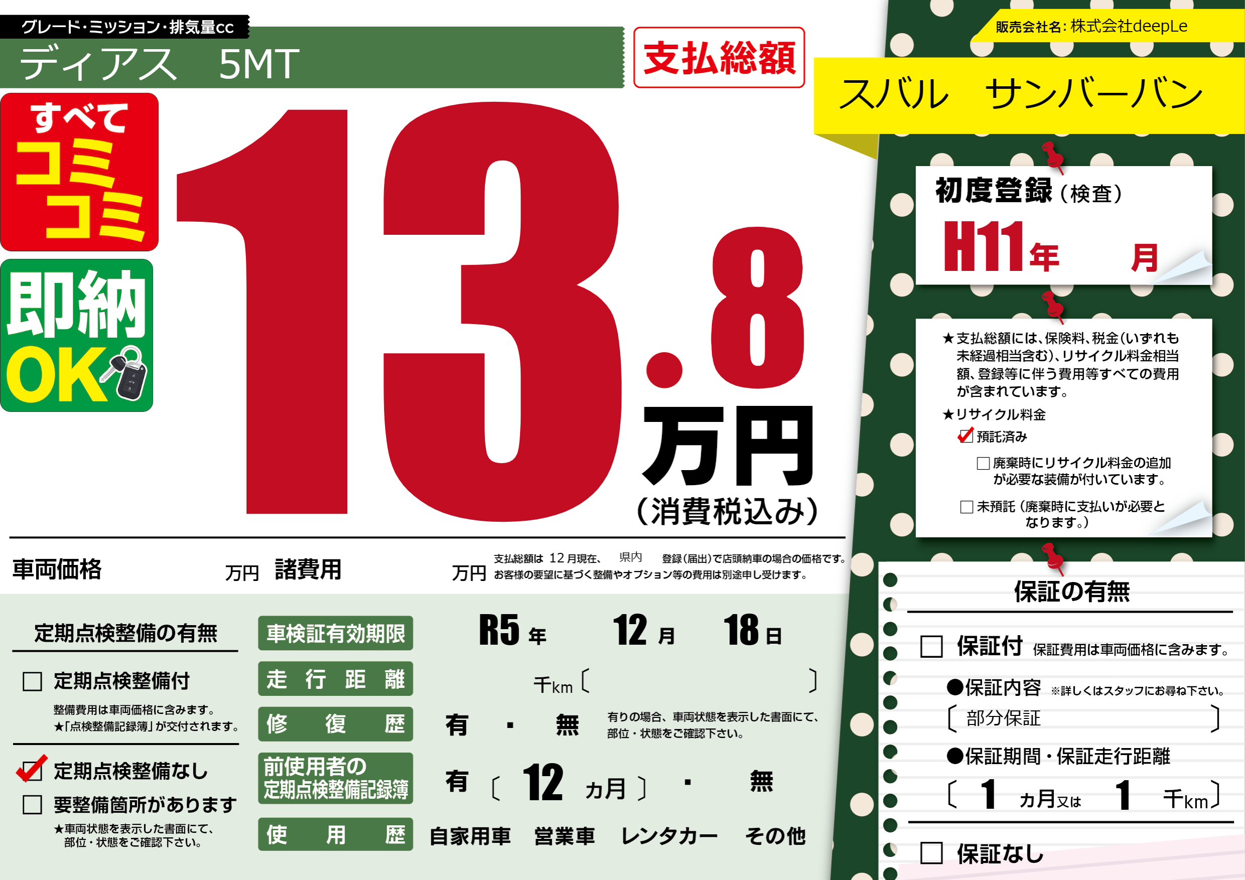 | 車名 | スバル サンバーバン | グレード ミッション 排気量 |