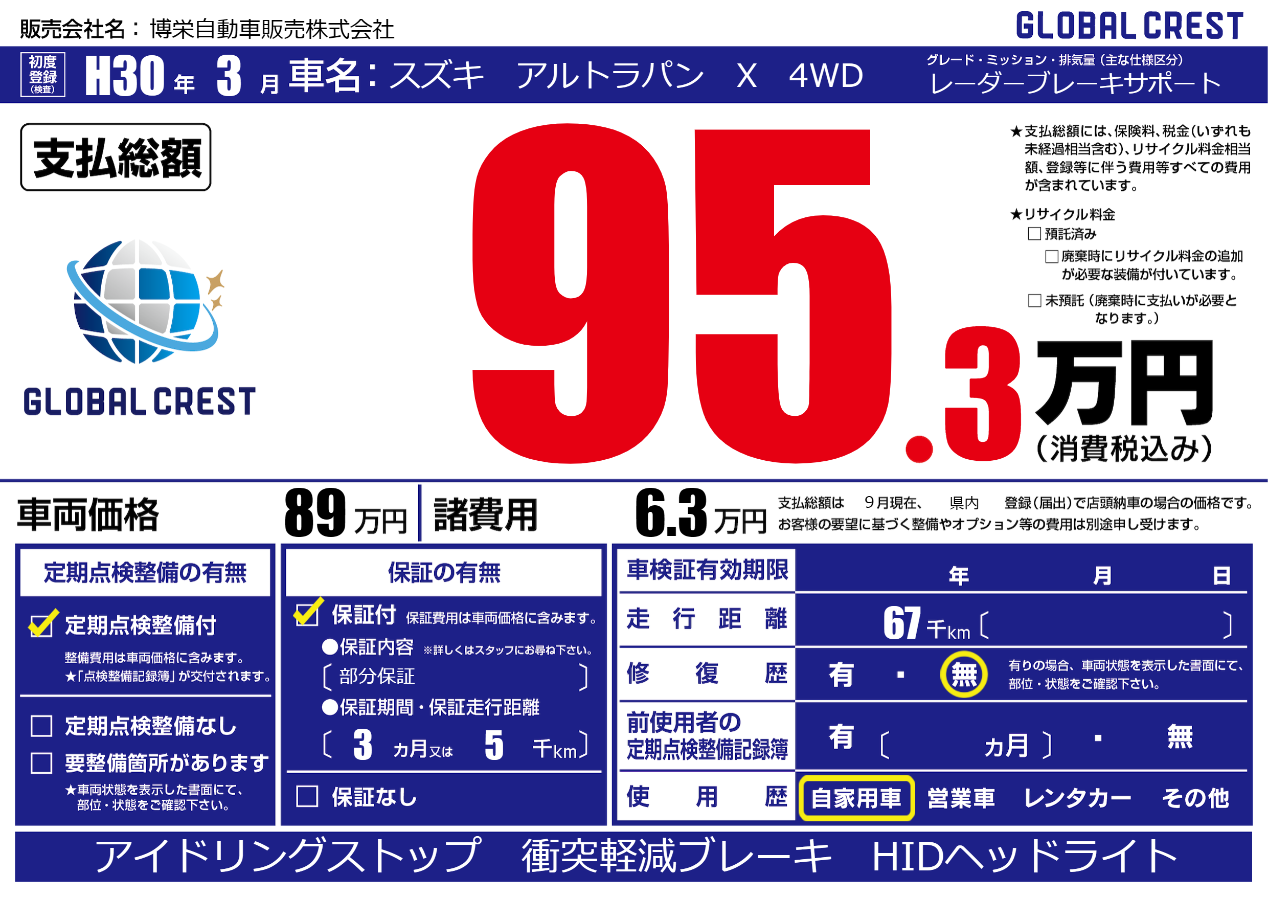 | 車名 | スズキ アルトラパン X 4WD | グレード ミッション 排気量 |