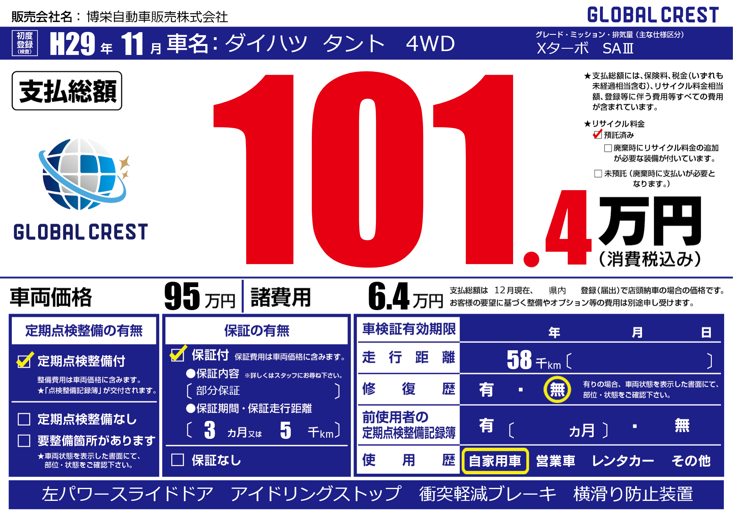 | 車名 | ダイハツ タント 4WD | グレード ミッション 排気量 |