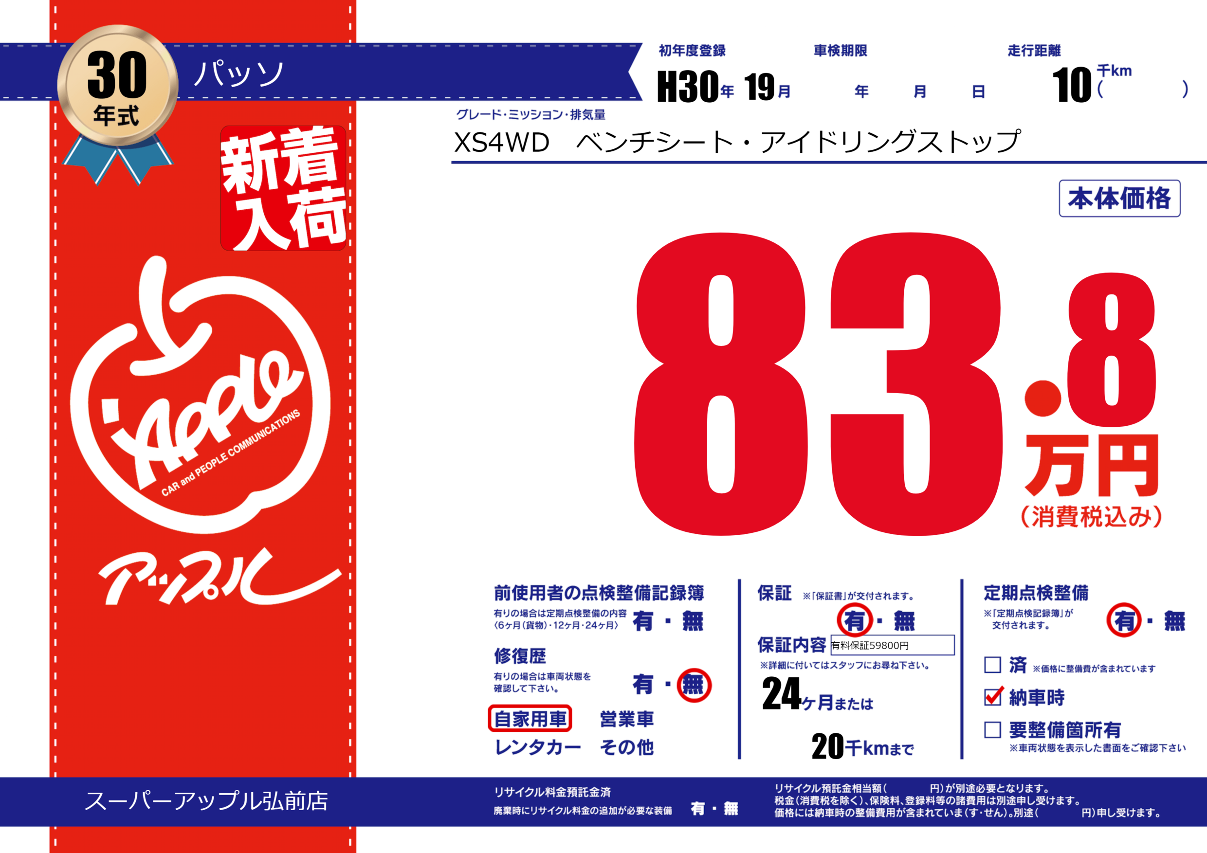 | 走行キロ | 1万km | 初年度登録 | H30年19月 |