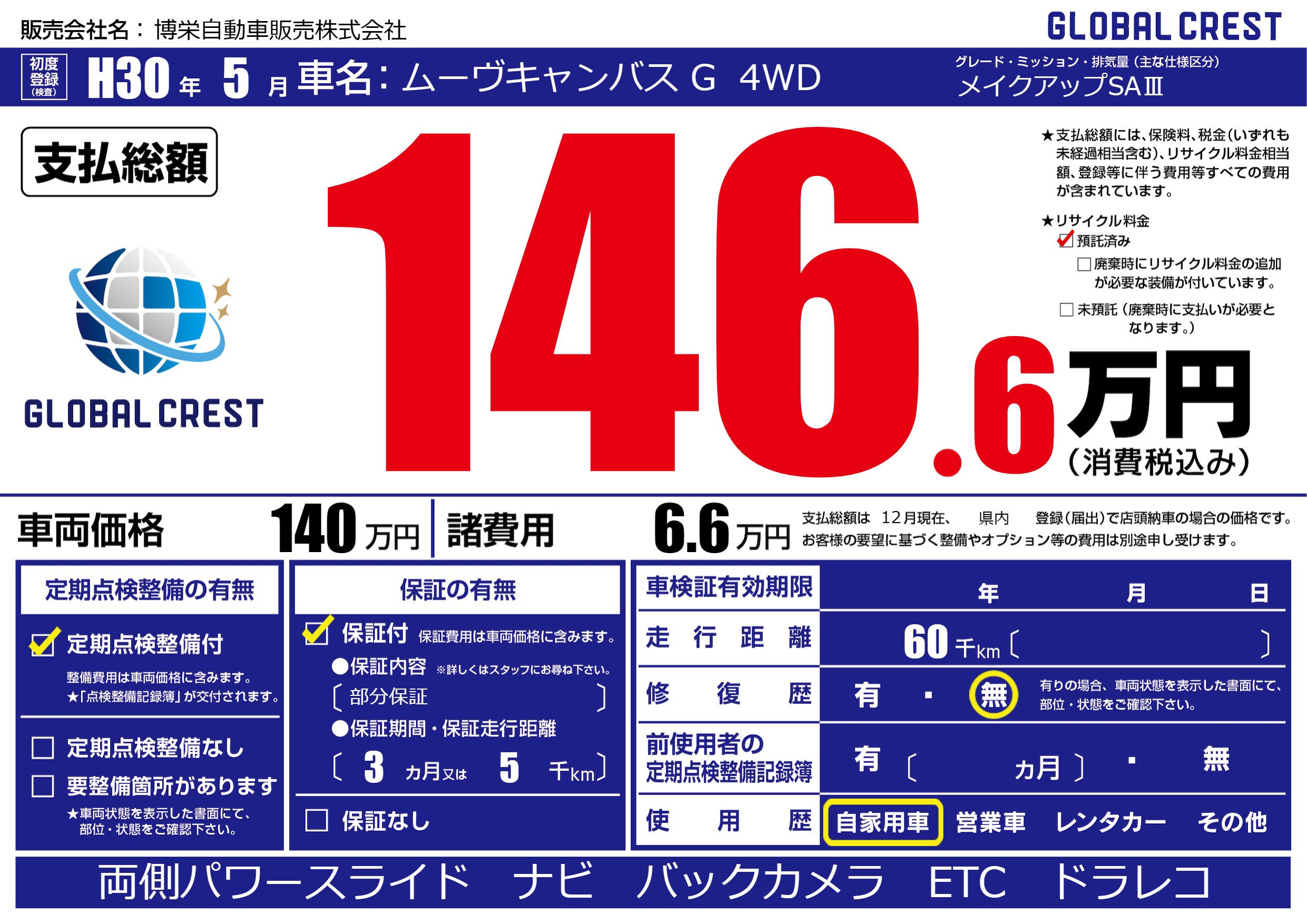| 走行キロ | 6万km | 初年度登録 | H30年5月 |