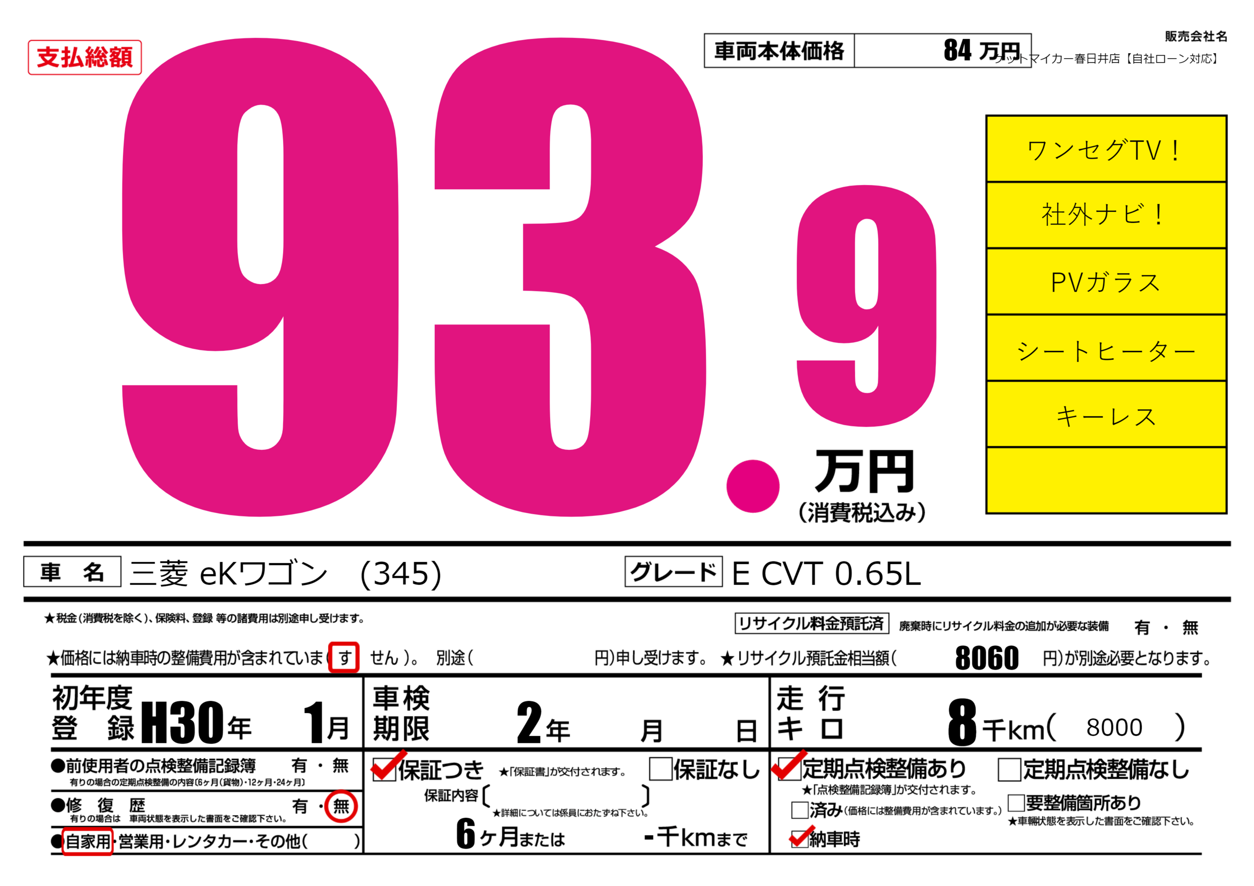| 車名 | 三菱 eKワゴン (345) | グレード ミッション 排気量 |