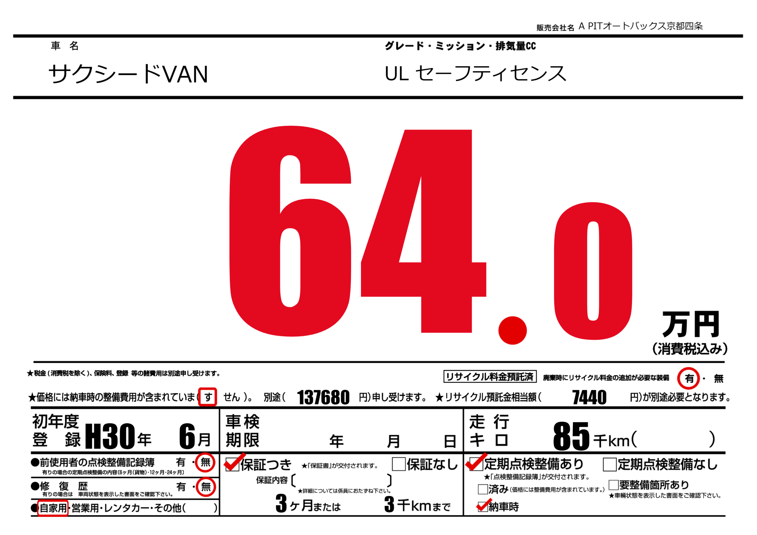 | 定期点検整備 | 定期点検整備あり 納車時あり | ||