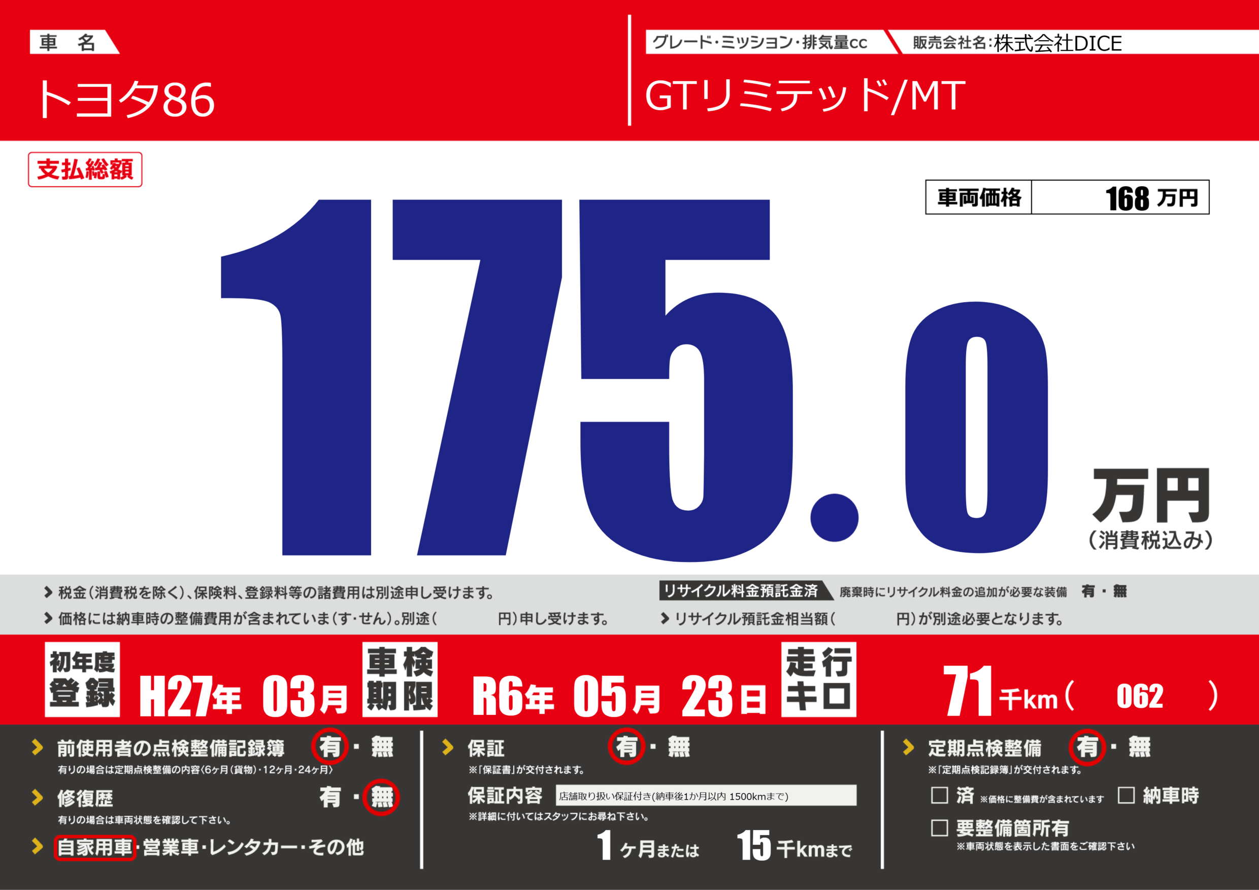 | 車名 | トヨタ86 | グレード ミッション 排気量 |