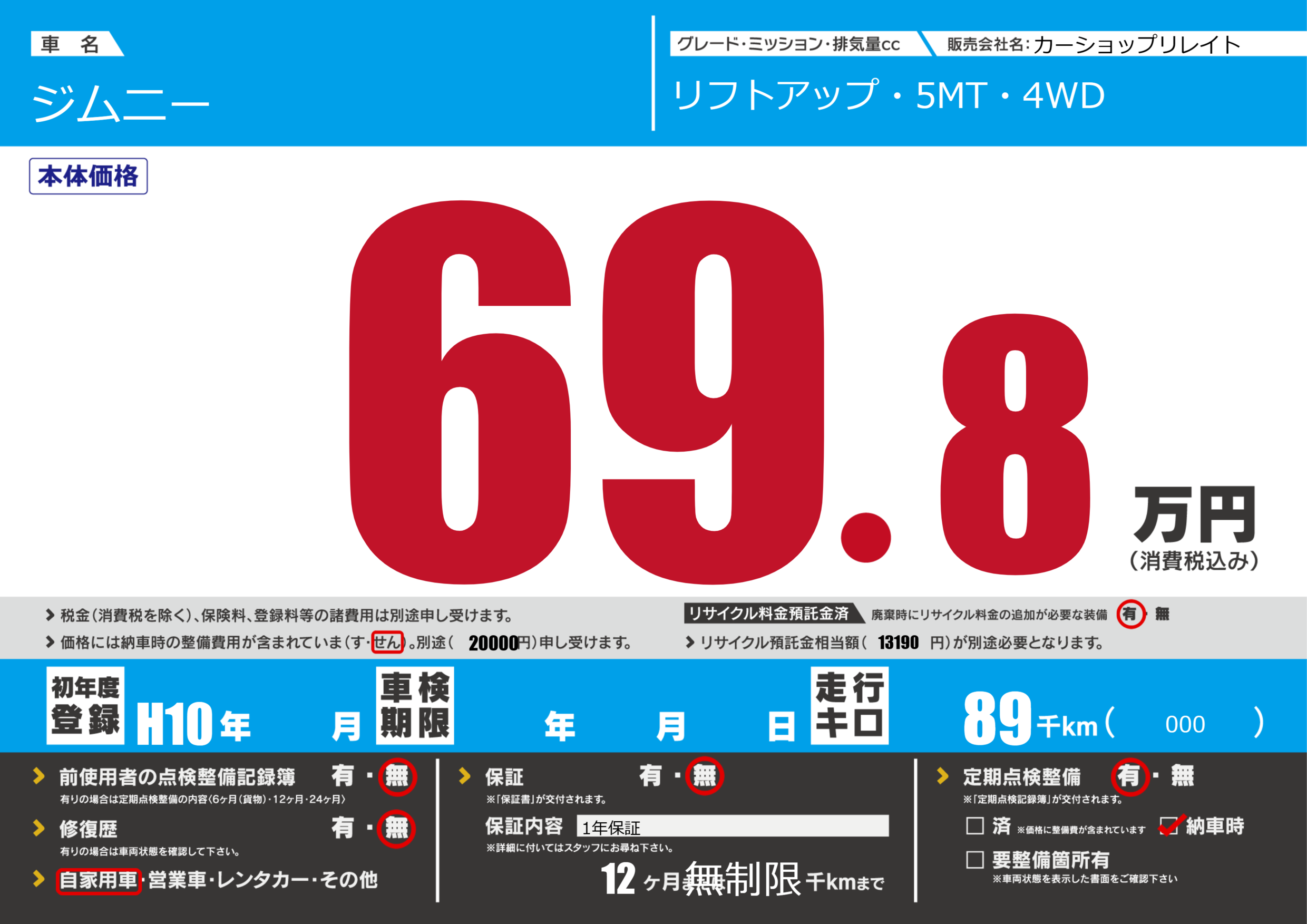 | 車名 | ジムニー | グレード ミッション 排気量 |