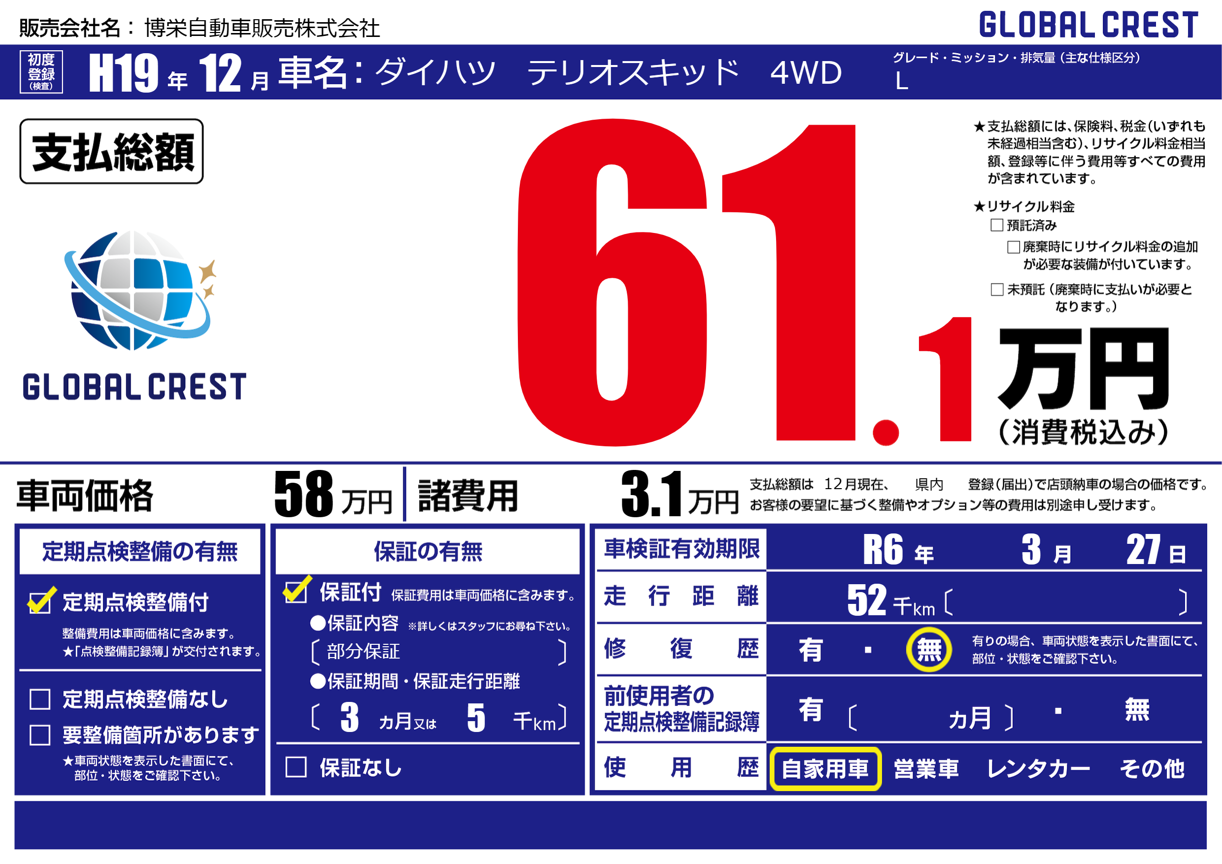 | 車検制限 | R6年 3月 27日 | ||