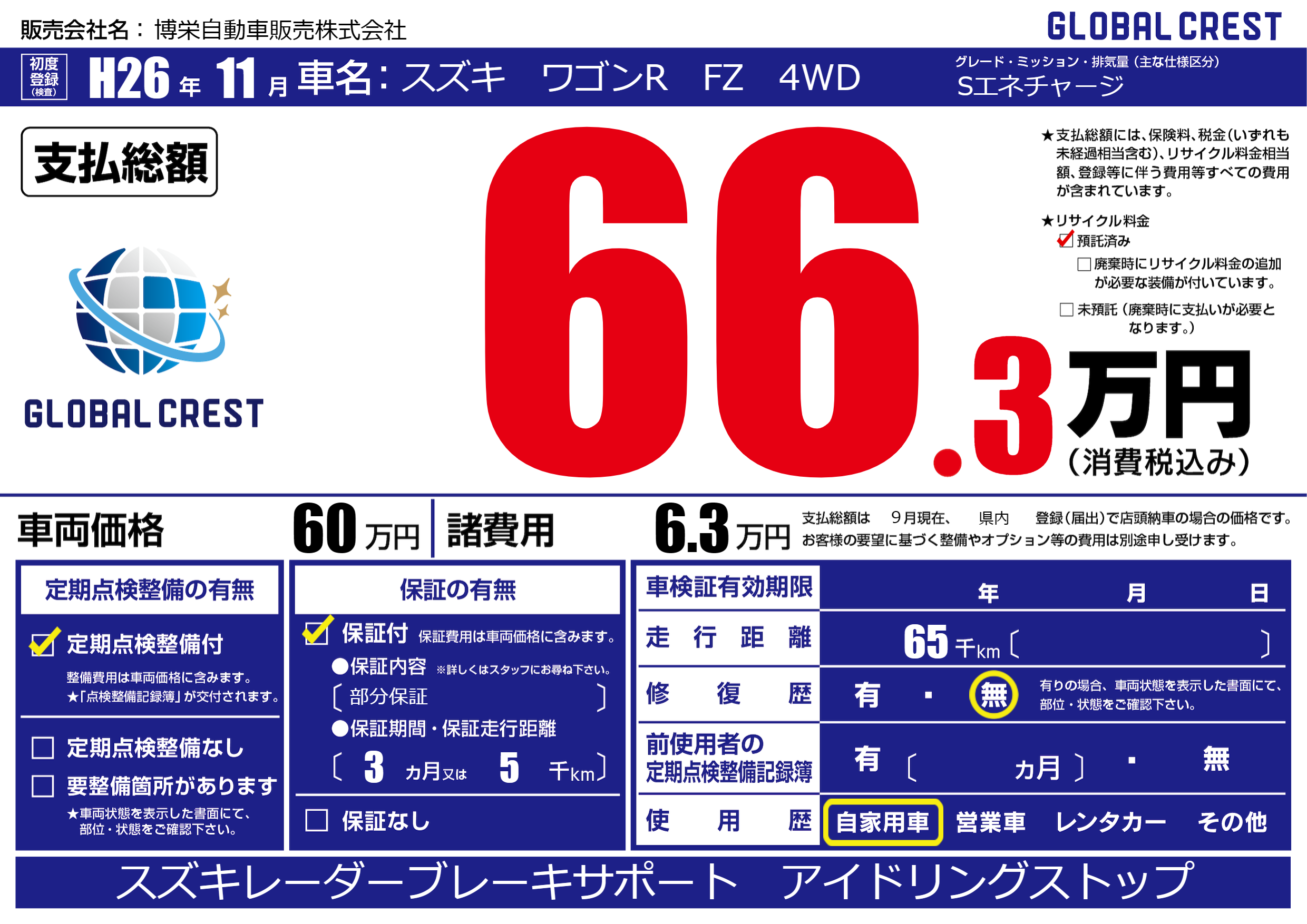 | 車名 | スズキ ワゴンR FZ 4WD | グレード ミッション 排気量 |