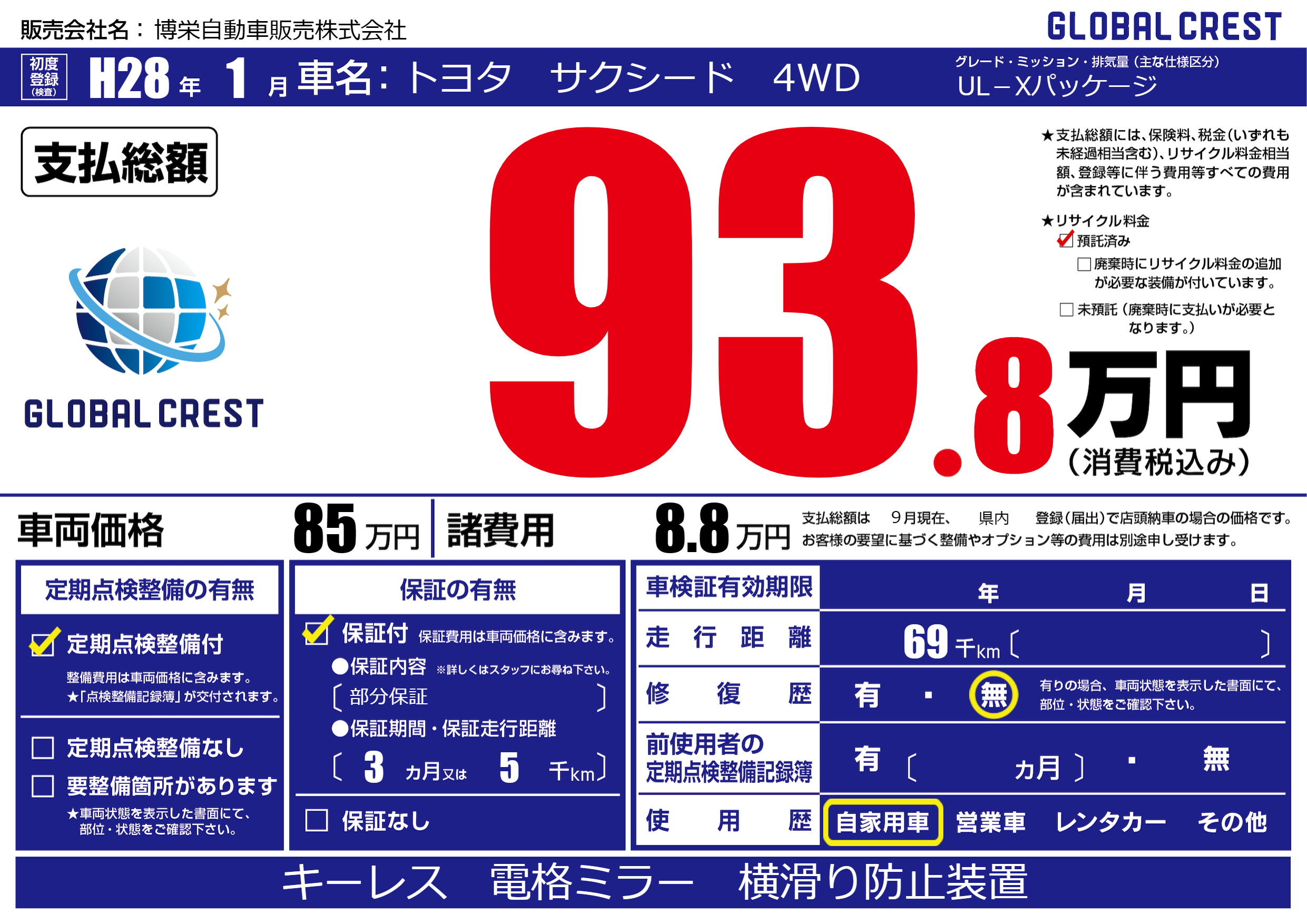 保証付き 保証内容(部分保証) 3ヶ月または(5)千kmまで |