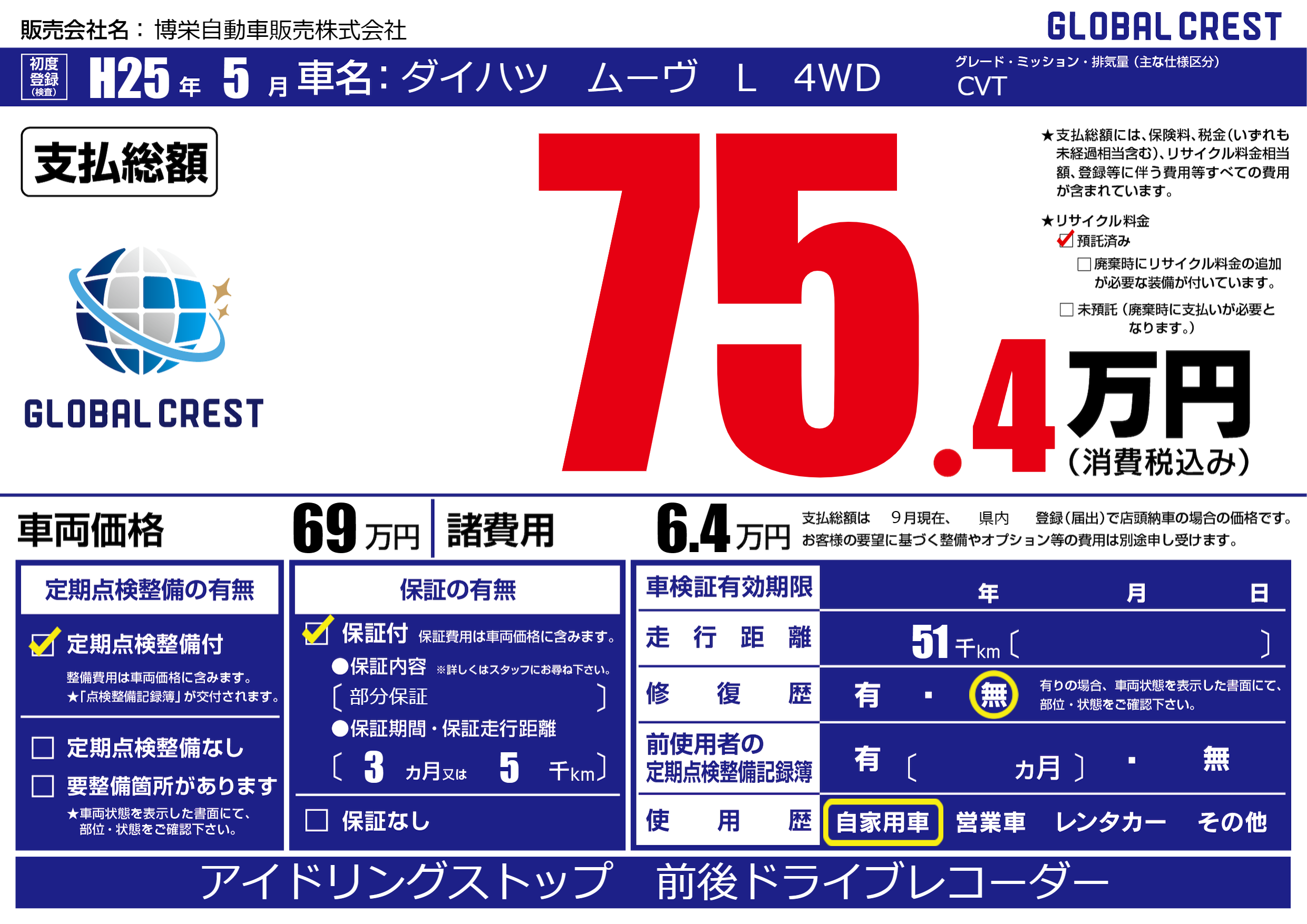 | 車名 | ダイハツ ムーヴ L 4WD | グレード ミッション 排気量 |
