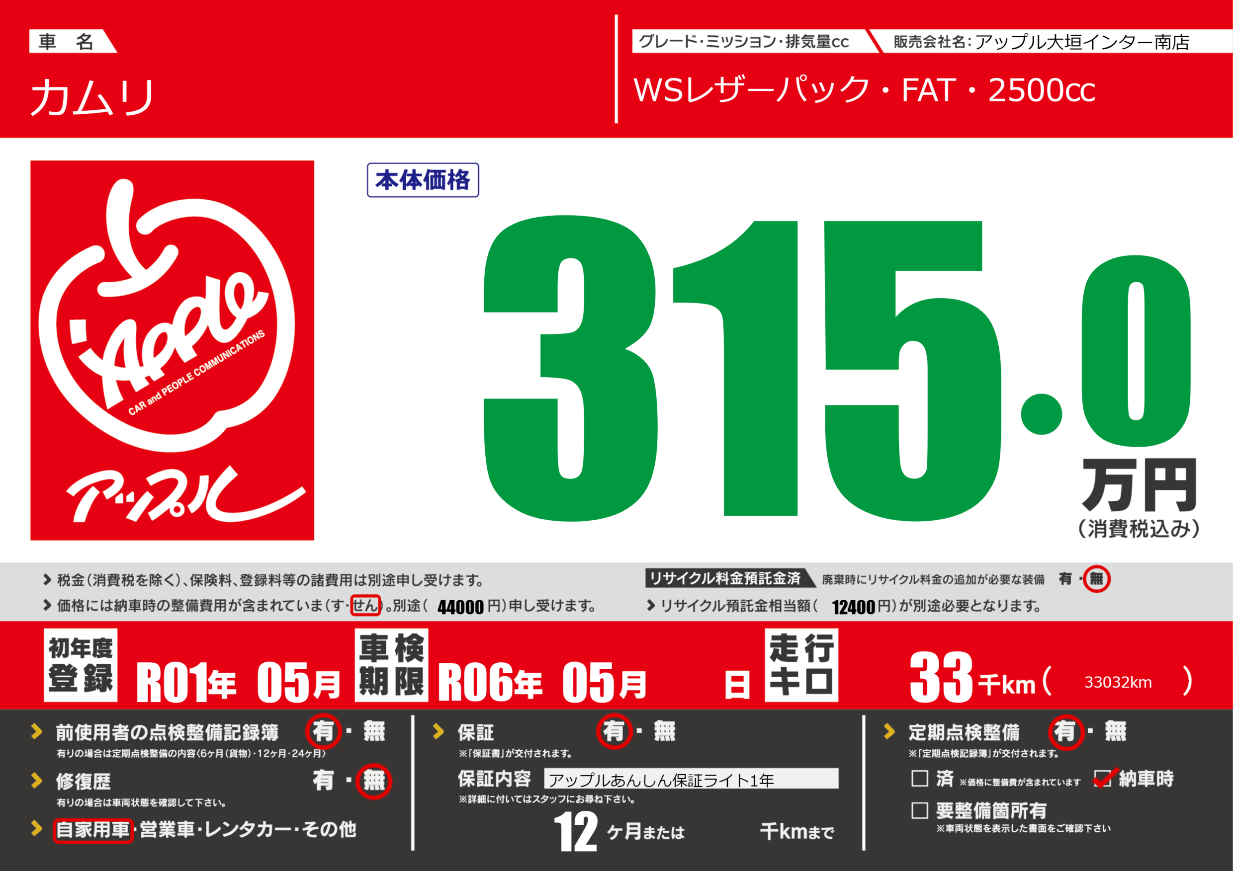 | 走行キロ | 3.3万km | 初年度登録 | R01年05月 |