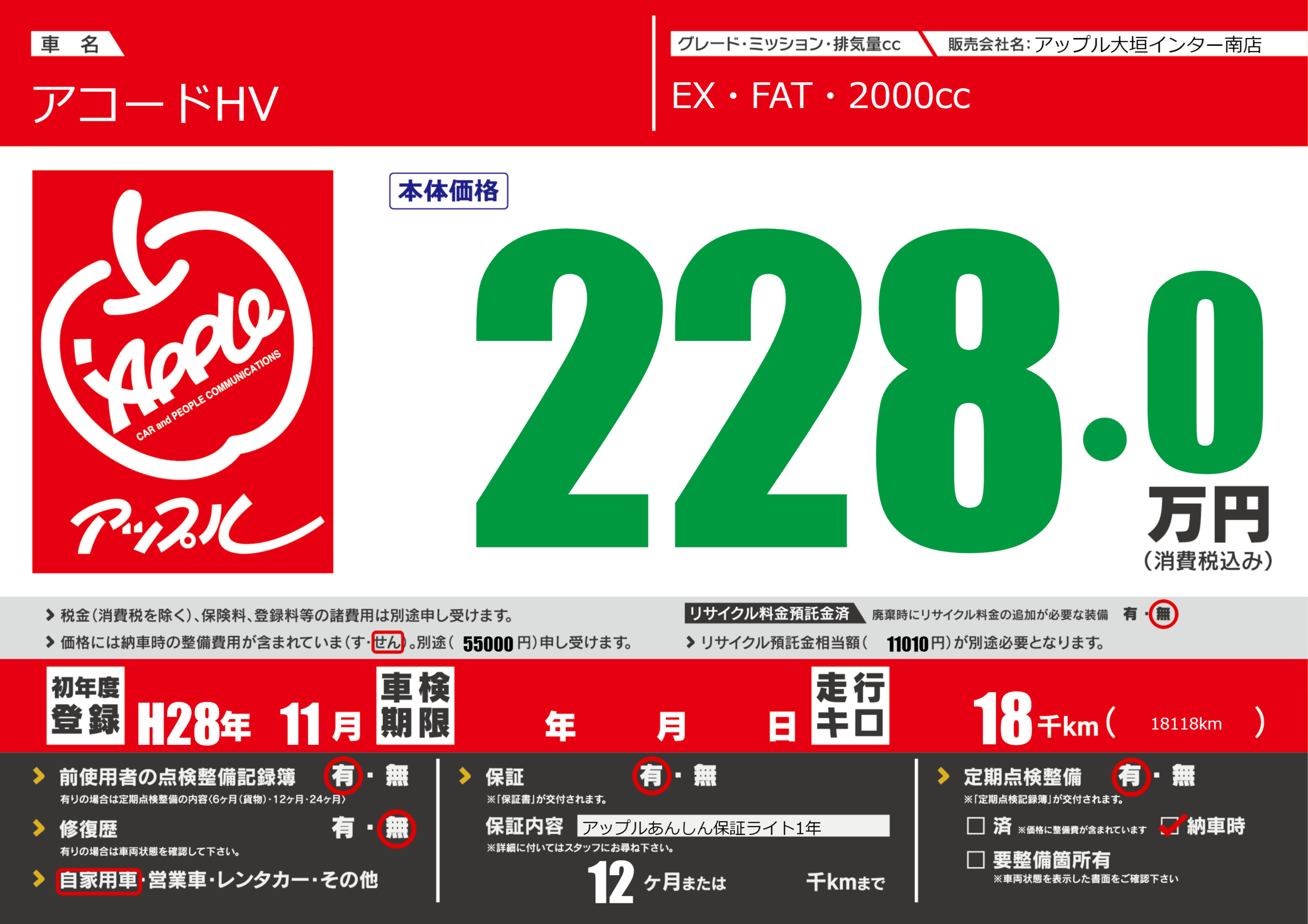 | 車名 | アコードHV | グレード ミッション 排気量 |