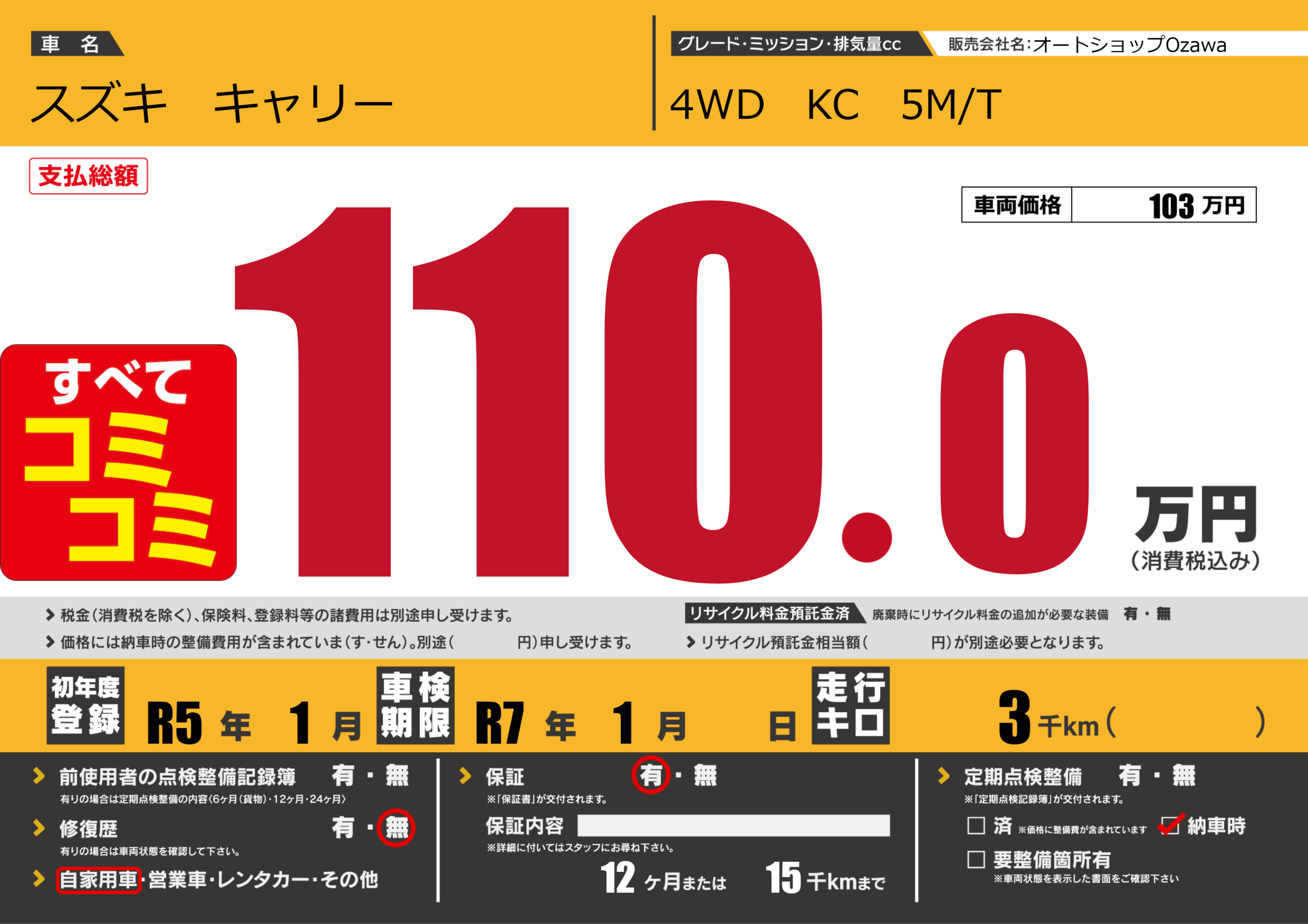 保証付き 保証内容(---) 12ヶ月または(15)千kmまで |