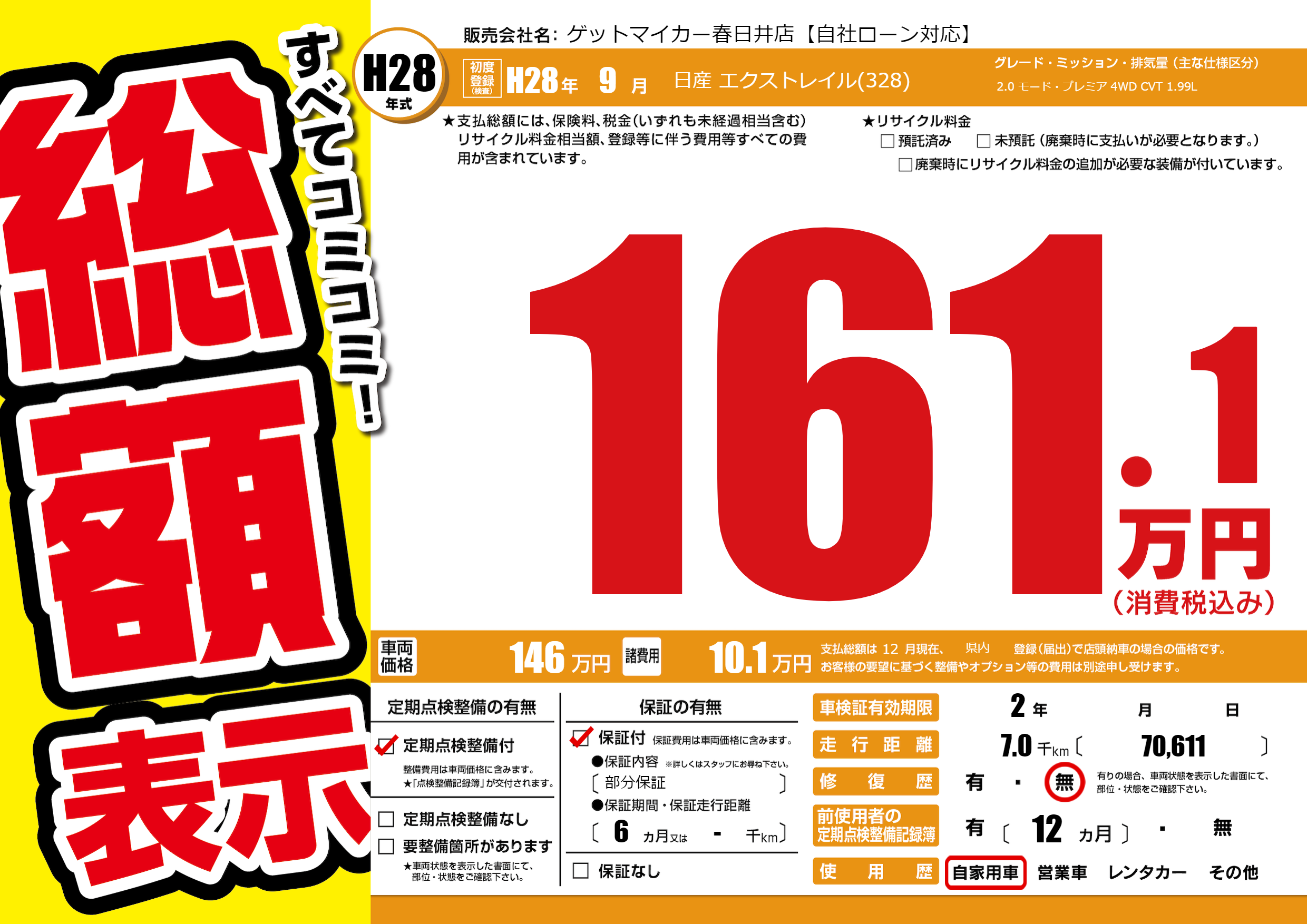 | 車名 | 日産 エクストレイル(328) | グレード ミッション 排気量 |