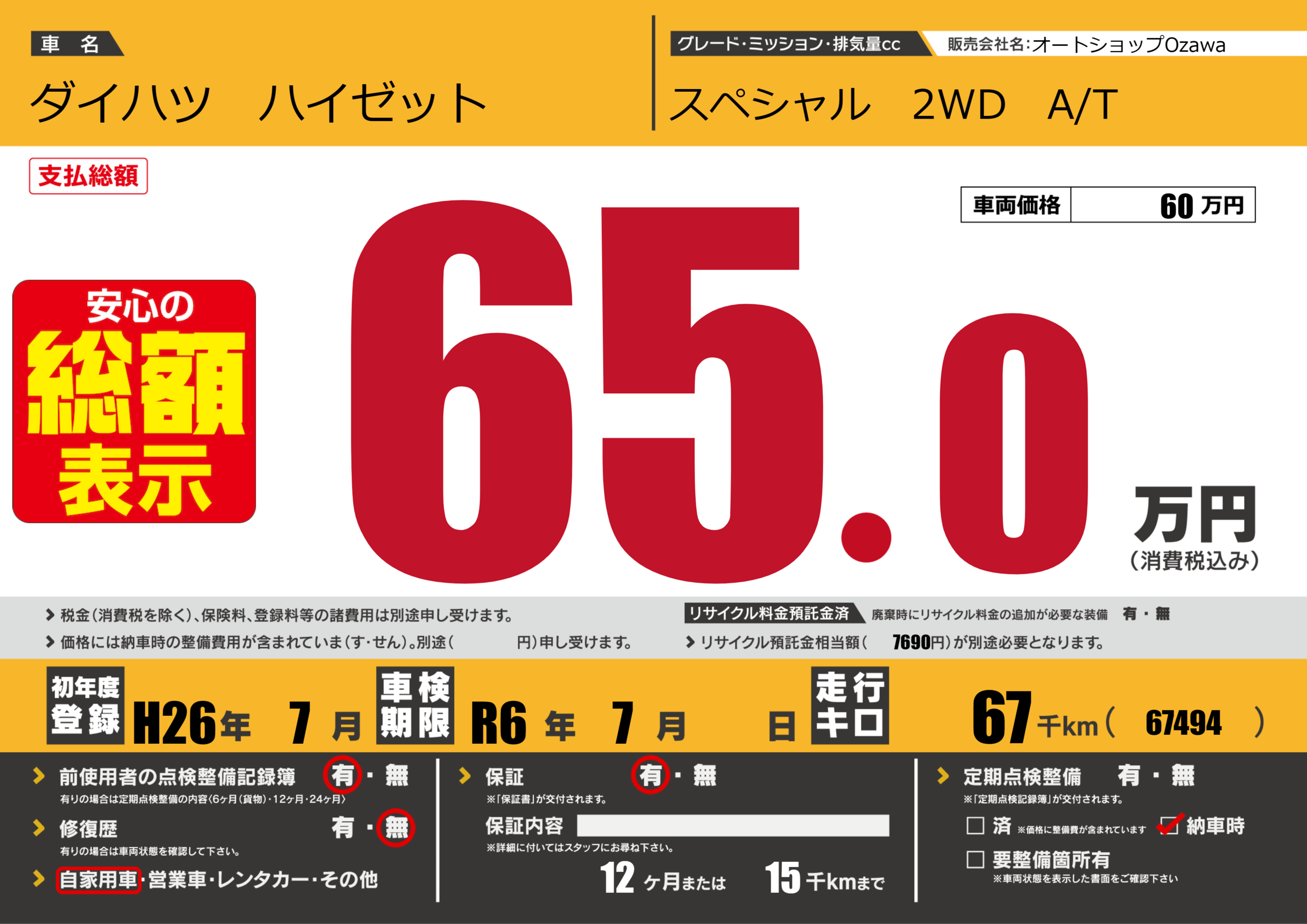 | 走行キロ | 6.7万km | 初年度登録 | H26年7月 |