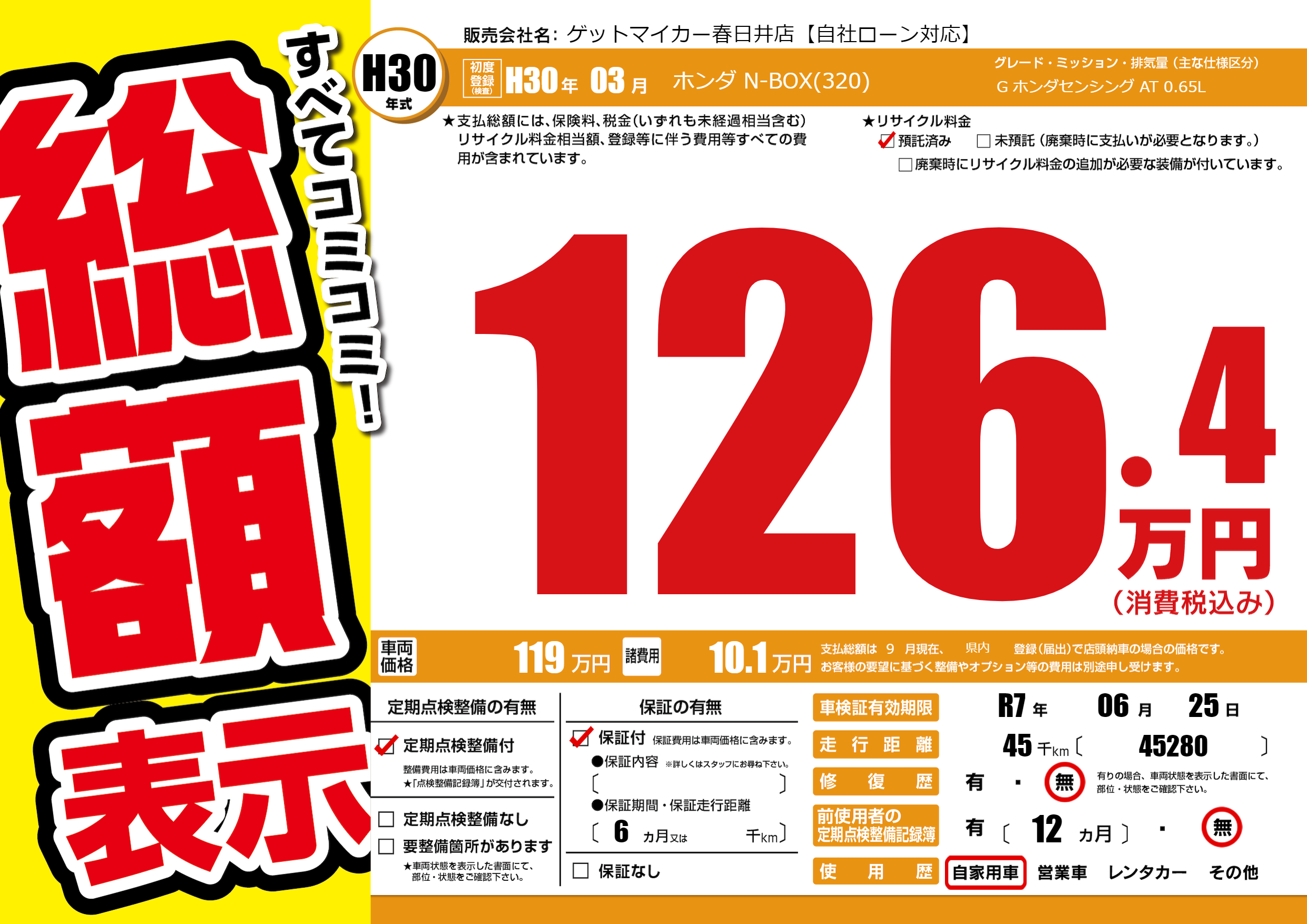 | 車名 | ホンダ N-BOX(320) | グレード ミッション 排気量 |