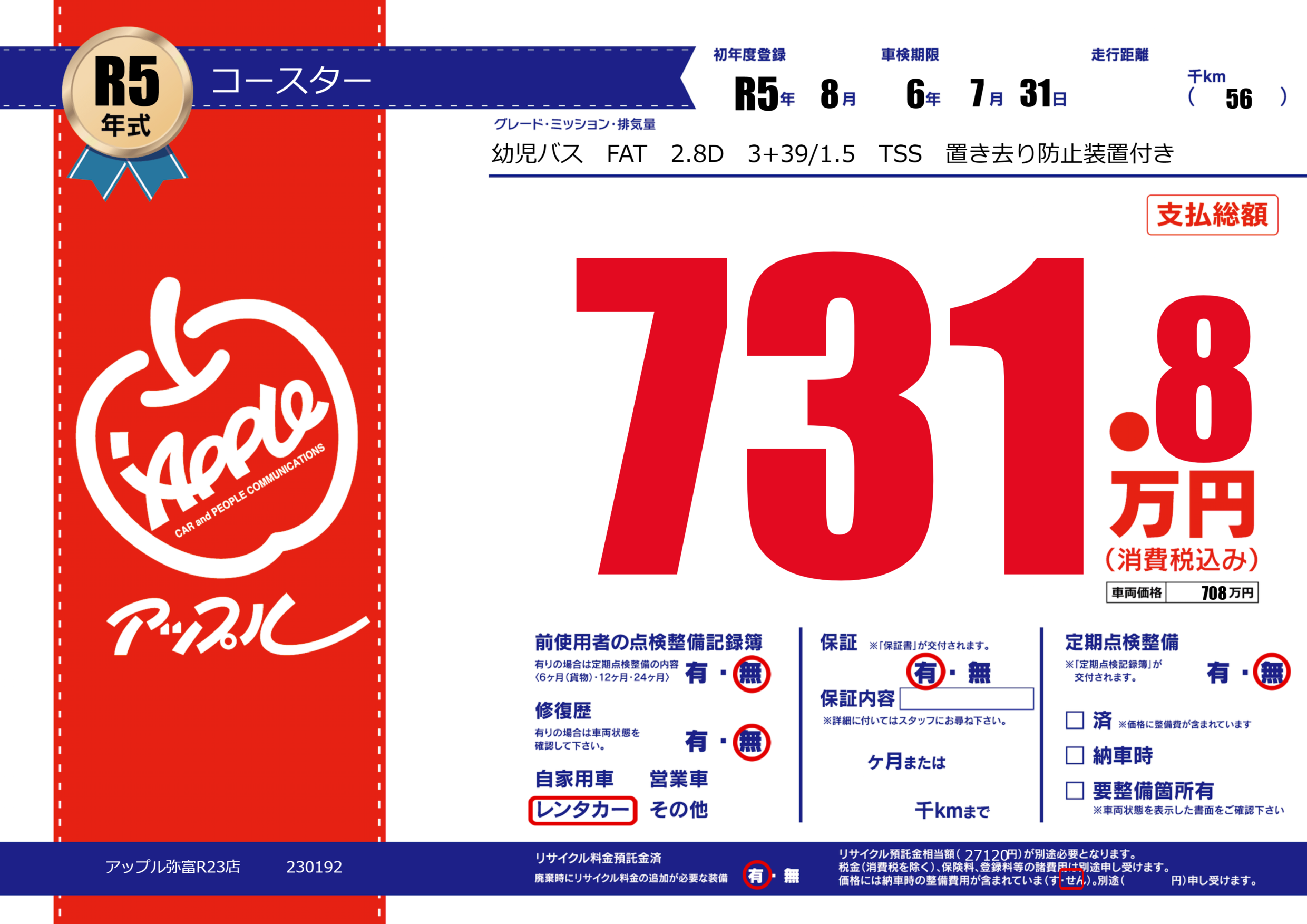 | 走行キロ | - | 初年度登録 | R5年8月 |