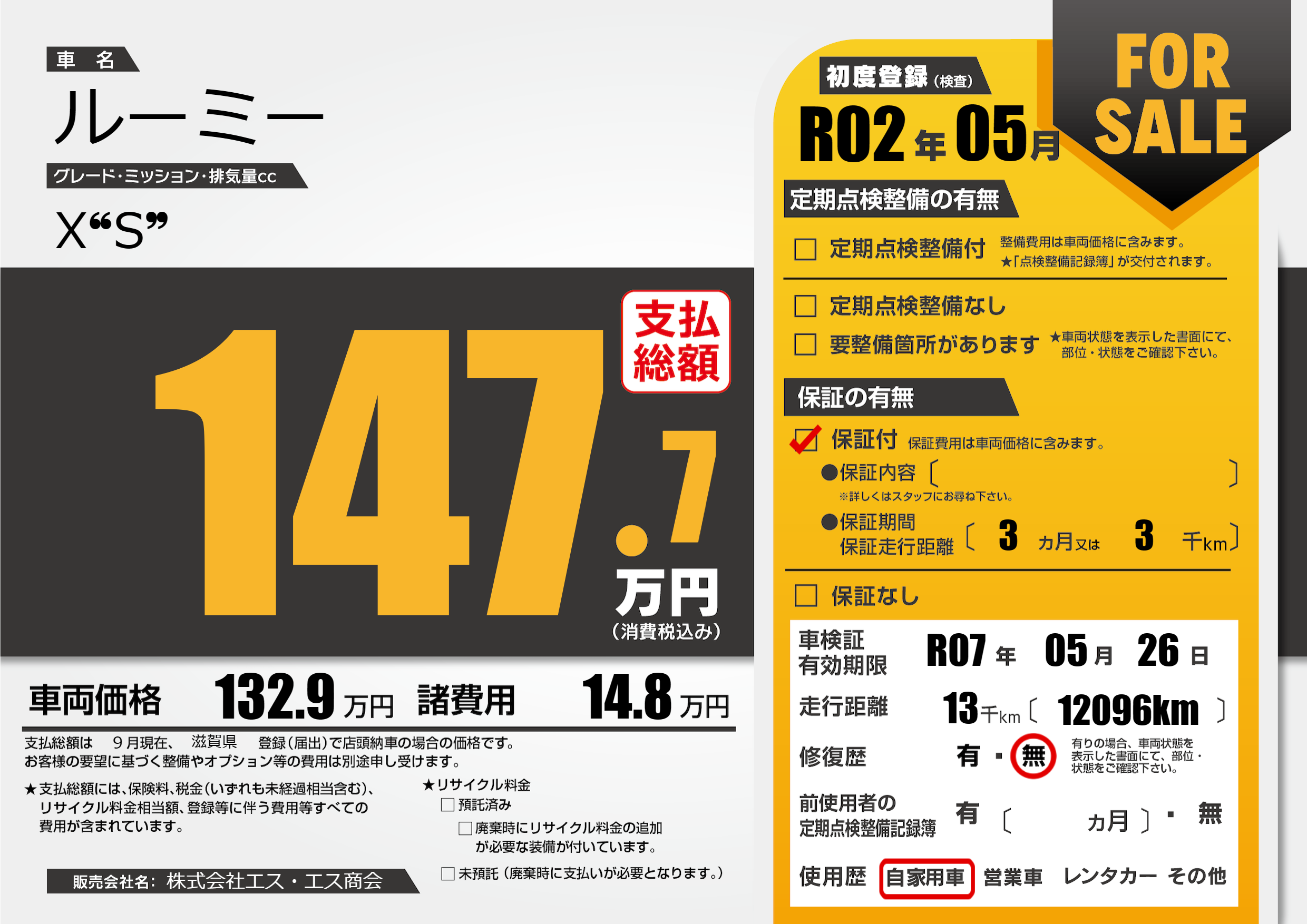 | 車名 | ルーミー | グレード ミッション 排気量 |