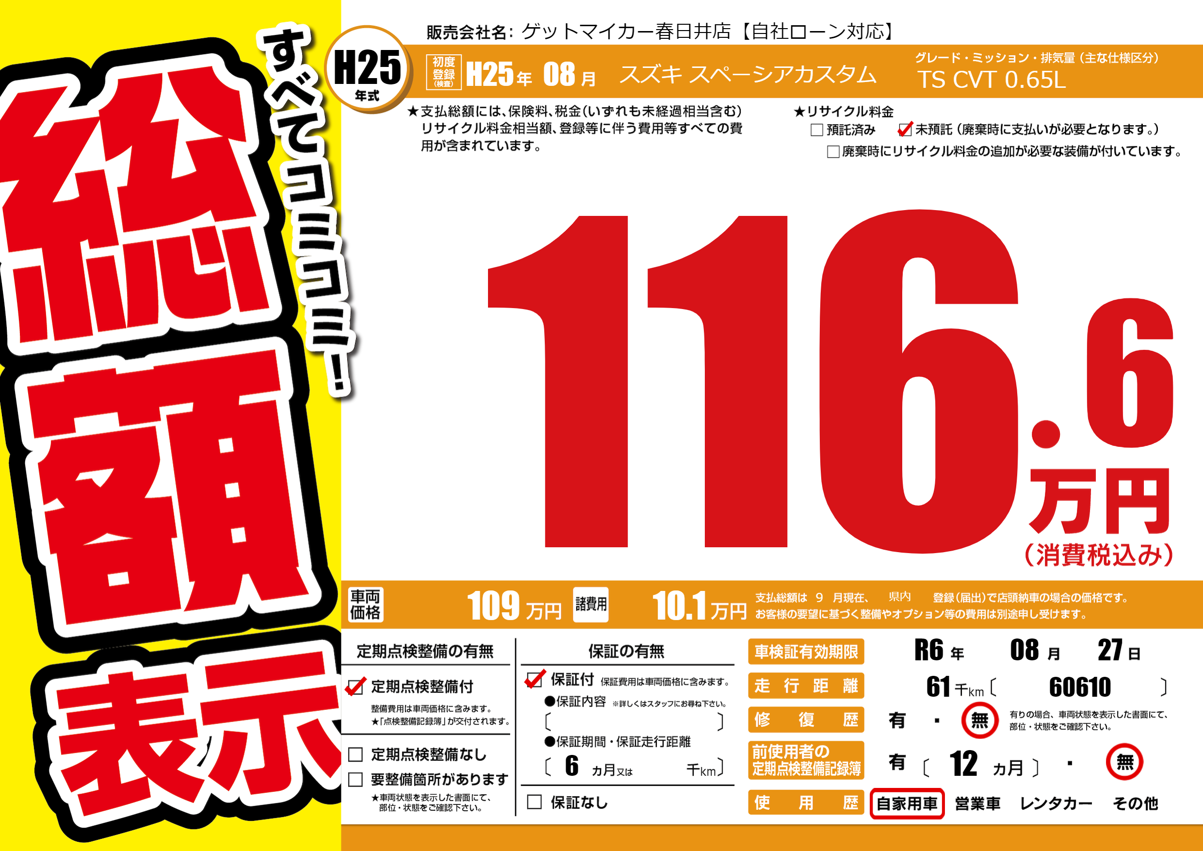 | 車名 | スズキ スペーシアカスタム | グレード ミッション 排気量 |