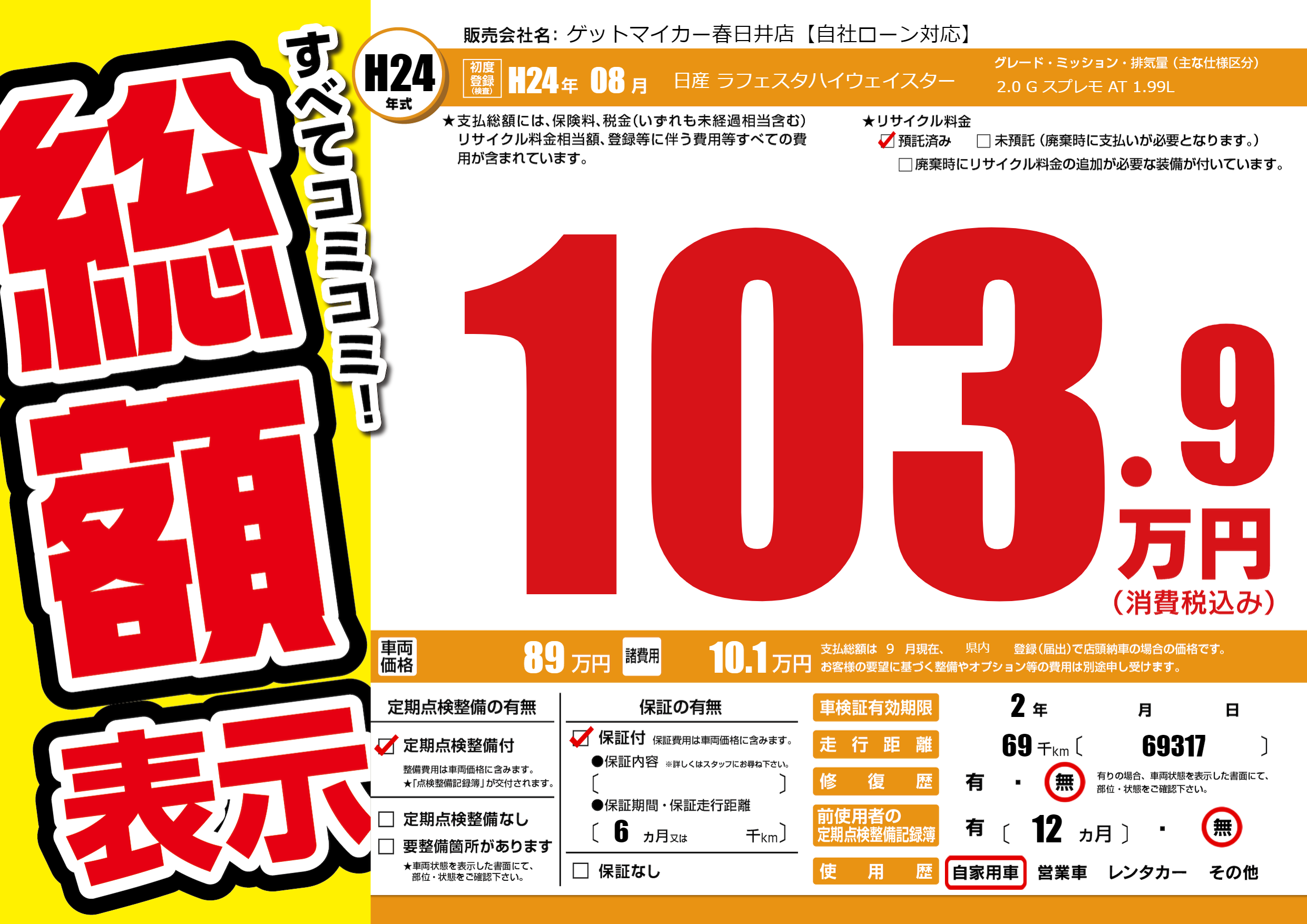 | 走行キロ | 6.9万km | 初年度登録 | H24年08月 |